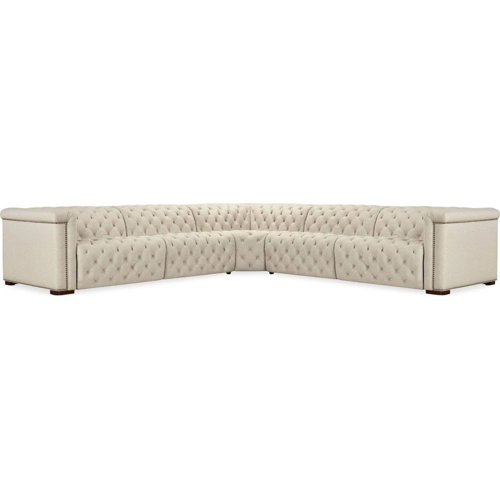 Description: Featuring three power recliners and six power headrests, the Savion Deux 5 Seat Sectional in Aries Beach performance fabric delivers a perfect balance of comfort and style. With dark wood accents, classic chesterfield tufting, and copper-toned nail trim, this sectional is designed for versatility and durability. The seamless reclining function ensures a luxurious seating experience, making it ideal for modern living spaces.