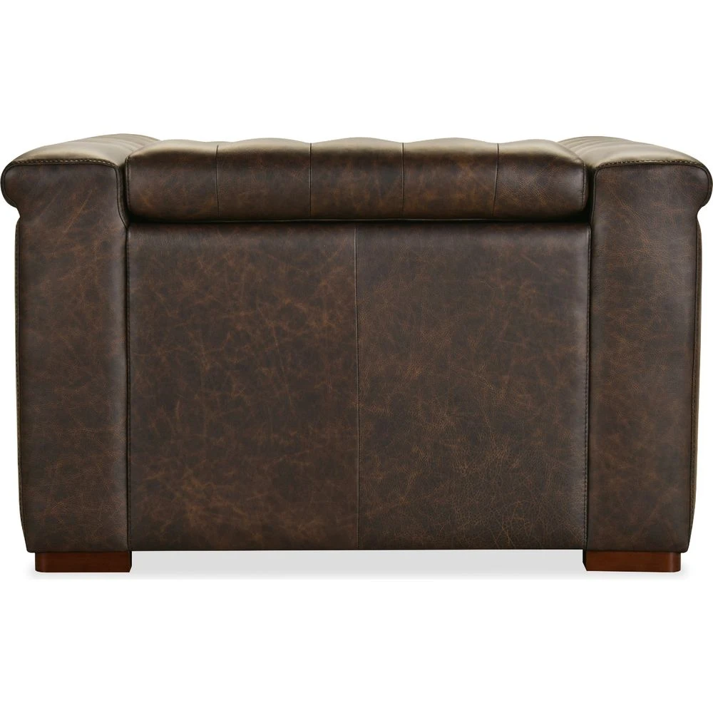 Description: Experience unmatched comfort with the Savion Deux Power Recliner, featuring a power headrest and power recline functionality. Upholstered in West Saddlewood Top Grain leather, it boasts classic chesterfield tufting and copper-toned accent nail trim. The dark wood finish complements the luxurious leather, delivering a sophisticated, timeless design. The seamless integration of modern reclining technology ensures an elegant, discreet look.