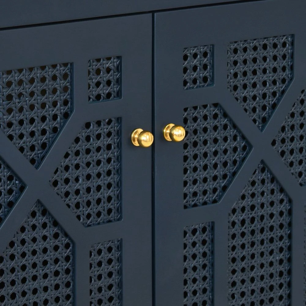 Description: Celebrate sophistication and craftsmanship with the exquisite Schaffer NVY bath vanity! Finished in a timeless matte navy lacquer, the vanity showcases handwoven cane door fronts, white with grey accents Carrara marble top, porcelain sink, and polished brass knobs. Each detail complements the other in a cohesive yet refined way. The Schaffer NVY is a standout!