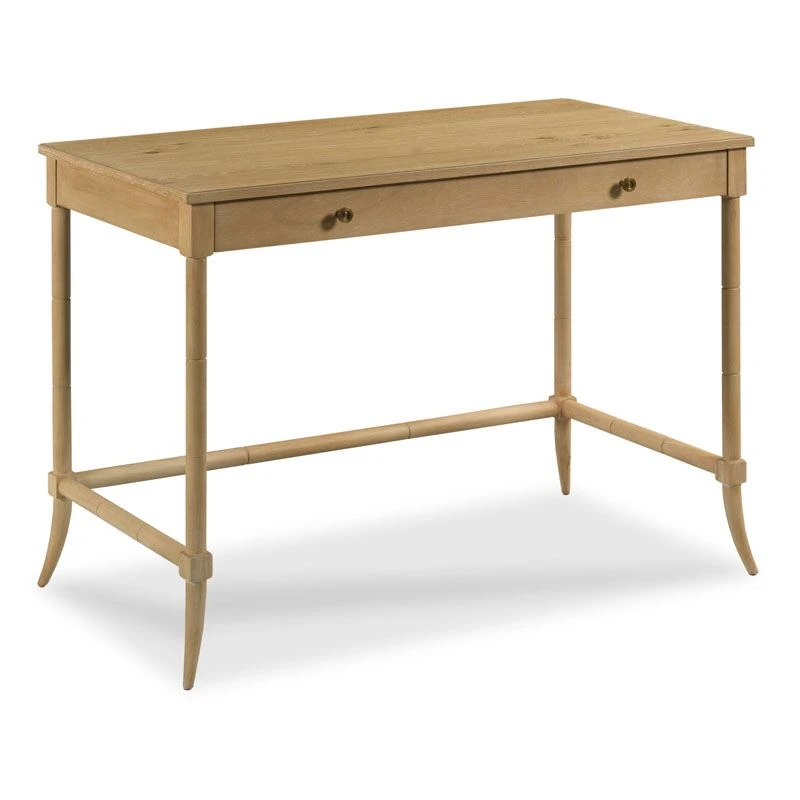 Description: A handsome table to have at your bedside for laptop use or writing. The design is adapted from 18th Century English originals from the regency period. A rectangular top is veneered with quartered oak over turned faux bamboo flared legs supporting an apron rail drawer.