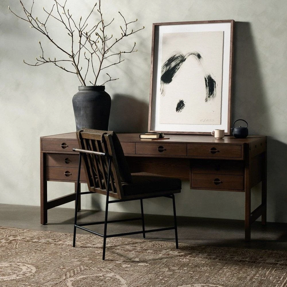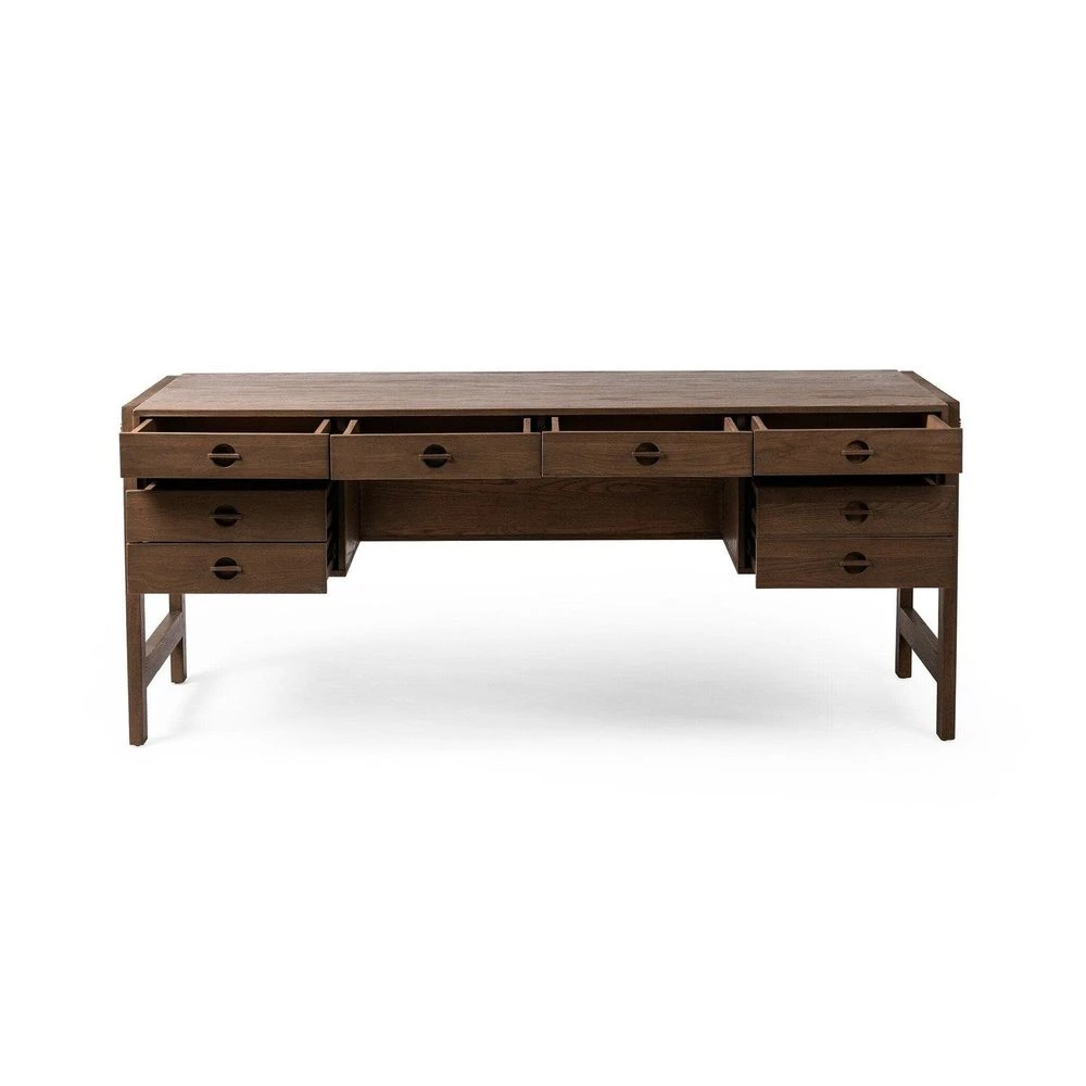 Description: Made from warm-toasted oak, brass-finished bolt covers add an aesthetic element to a storage-driven desk. Eight drawers plus open shelving offer plenty of space for office staples.