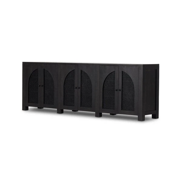 Grand in scale and presence. Black-washed mango encases arched cane door panels featuring black-finished iron hardware, meeting a forward-thinking material mix with monochromatic vibes.