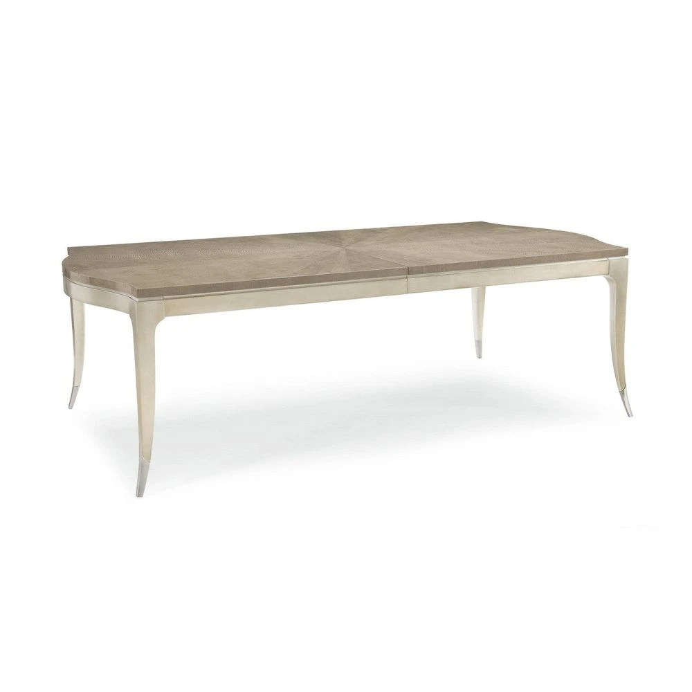 Set the table, set the mood with this elegantly shaped dining table. Its Silver Curly Maple top wears a Moonlit Sand finish while its legs and apron are highlighted with Soft Silver Leaf. Smartly designed to expand for entertaining, this gracious table boasts a finished length of 144 inches with the addition of its two 24-inch leaves. Metal ferrules add a distinctive finishing touch to its legs.