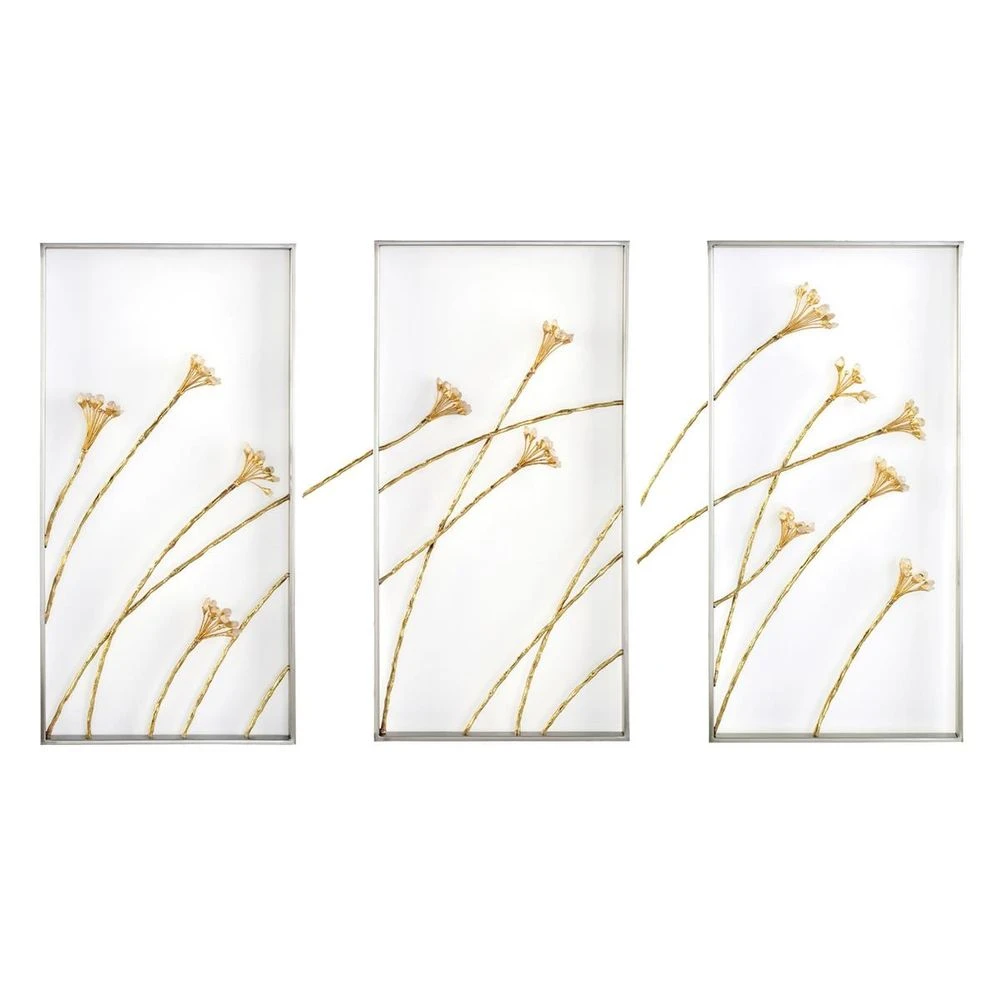 A windswept triptych in polished brass with natural gemstones creates this beautiful wall hanging.