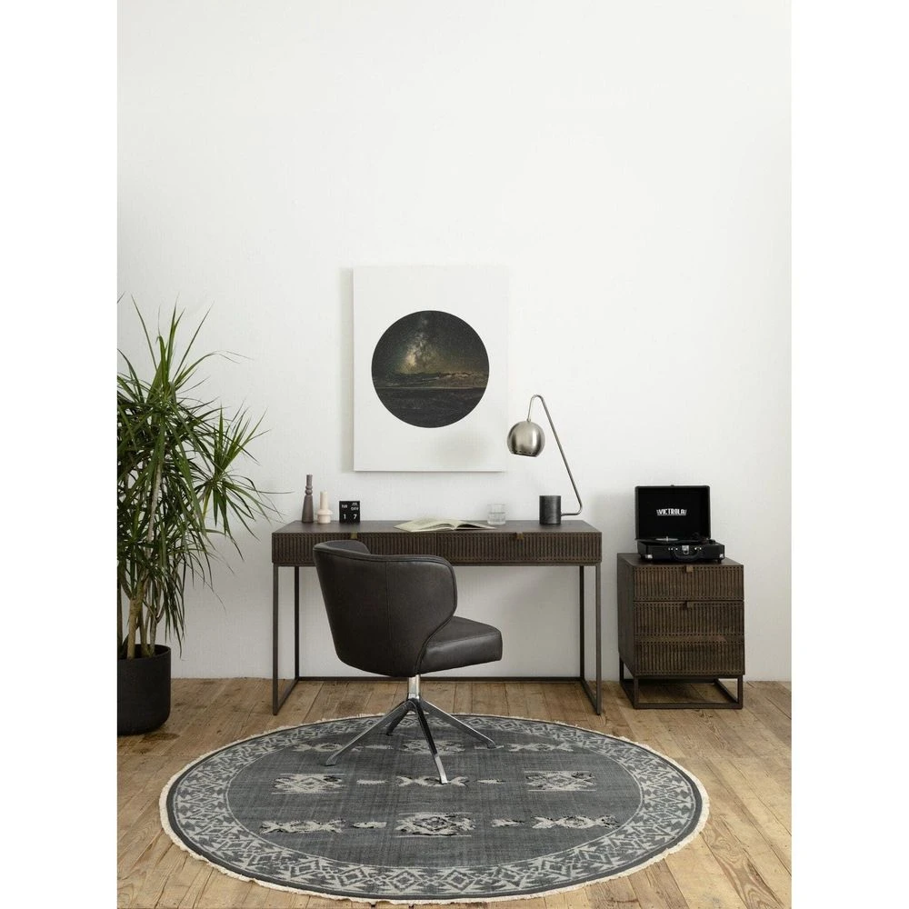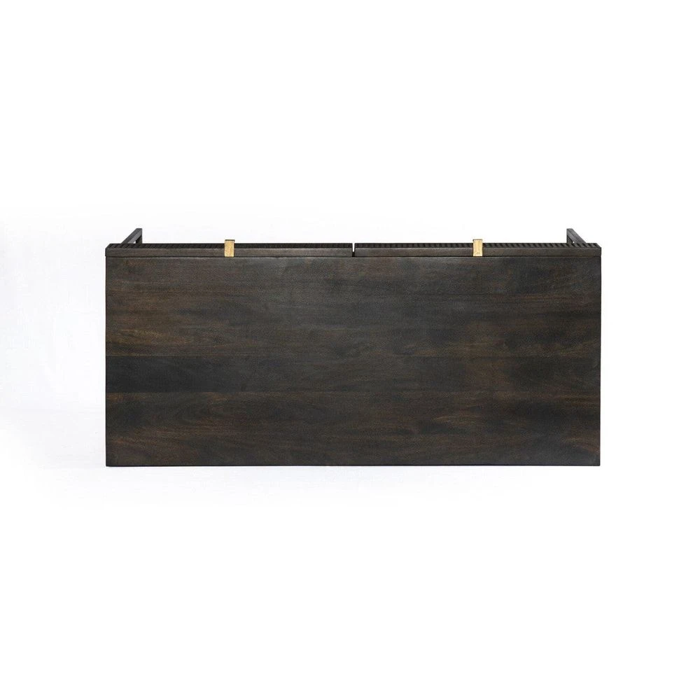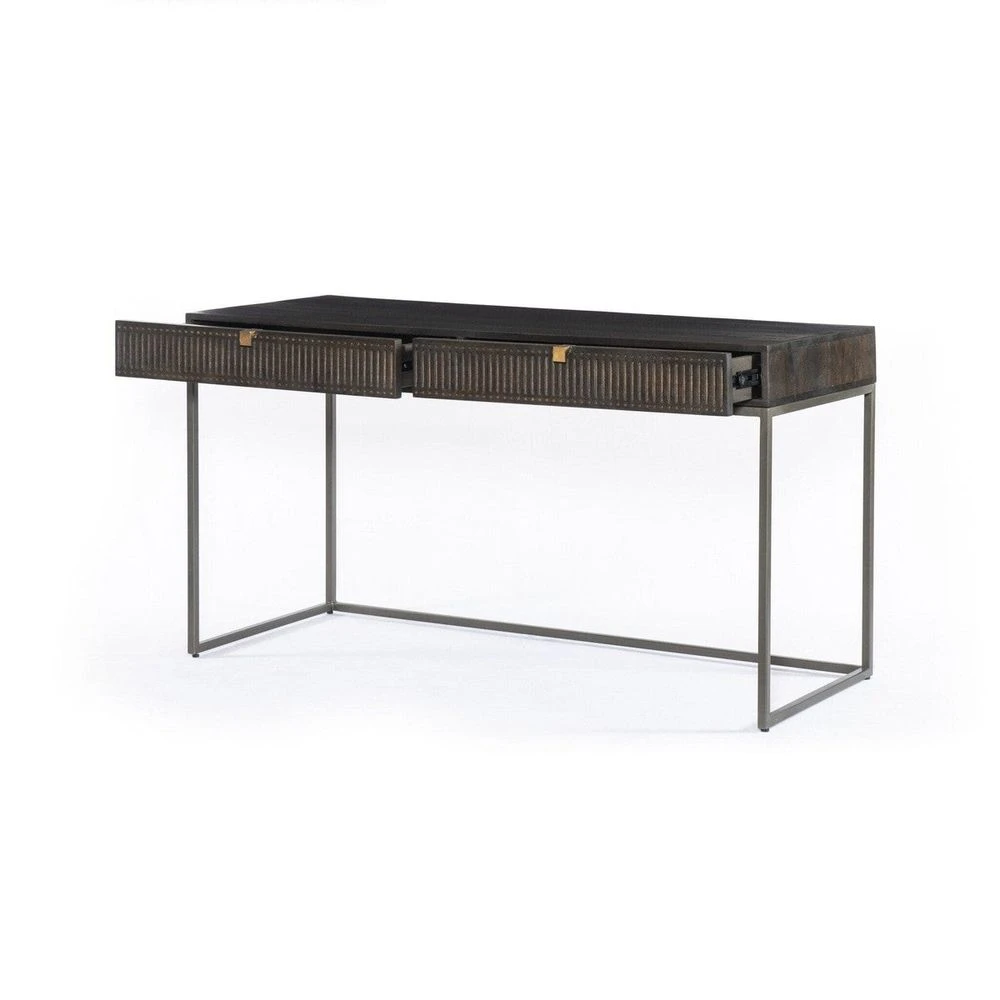 - Description: Unique linear carving meets fresh dimension with an artisan slant. Mango wood casing is finished in a vintage brown, highlighting texture and high craftsmanship. A slim iron base adds a long, airy look, while dual drawers keep desk necessities on hand.