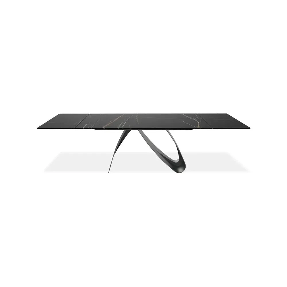 Description: THE SIGNATURE TABLE IS MADE FROM A SOLID STEEL BASE WITH A CERAMIC SURFACE TOP. THIS CERAMIC IS SUPER STYLISH WITH ITS WILD SAFARI FINISH AND IS ALSO DURABLE AND PRACTICAL. THE CERAMIC TOP IS SCRATCH PROOF AND STAIN PROOF. YOU CAN EASILY LET WINE, MUSTARD, CURRY, FRUIT JUICE, AND OTHER STAINABLE SOURCES SIT WITHOUT WORRY AND EASILY WIPE OFF WITH SOAP AND WATER. THE TABLE BOASTS TWO MANUALLY EXTENDING LEAVES THAT SELF STORE WHEN THE TABLE IS CLOSED INTO THE SMALLER CONFIGURATION.