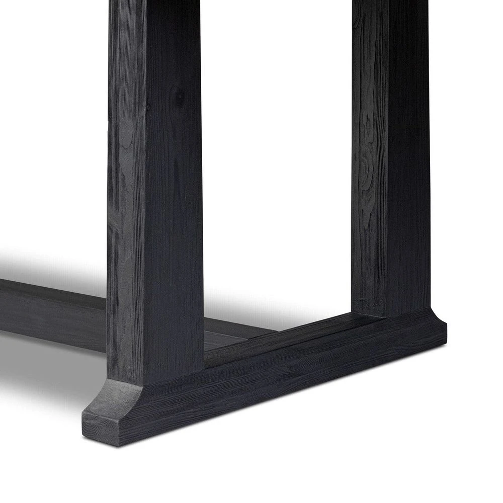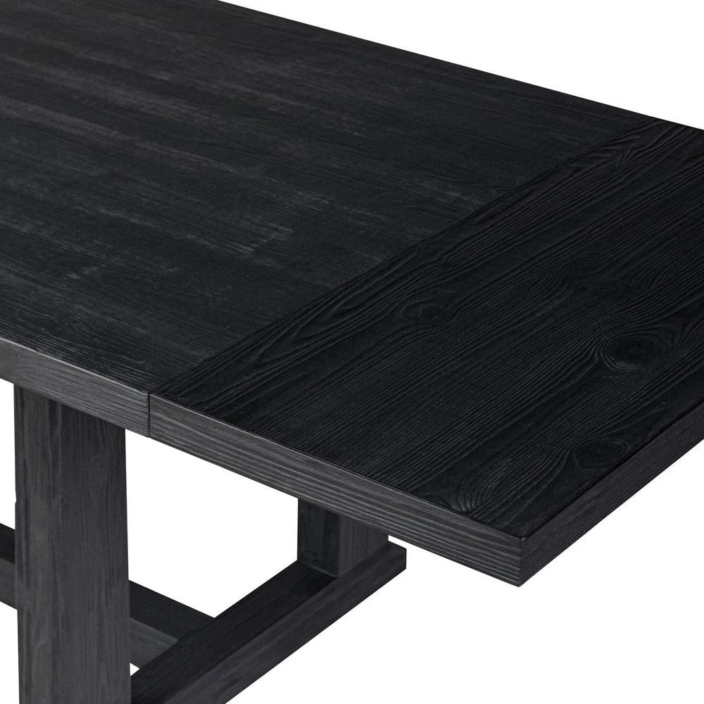 Description: Bring a traditional sense to the table. Finished in a classic black, a trestle base of solid pine supports a rectangular pine top, waxed and bleached for a rustic look. Two slide-in bread boards create more room at the table for guests, expanding from 86″ to 120″.