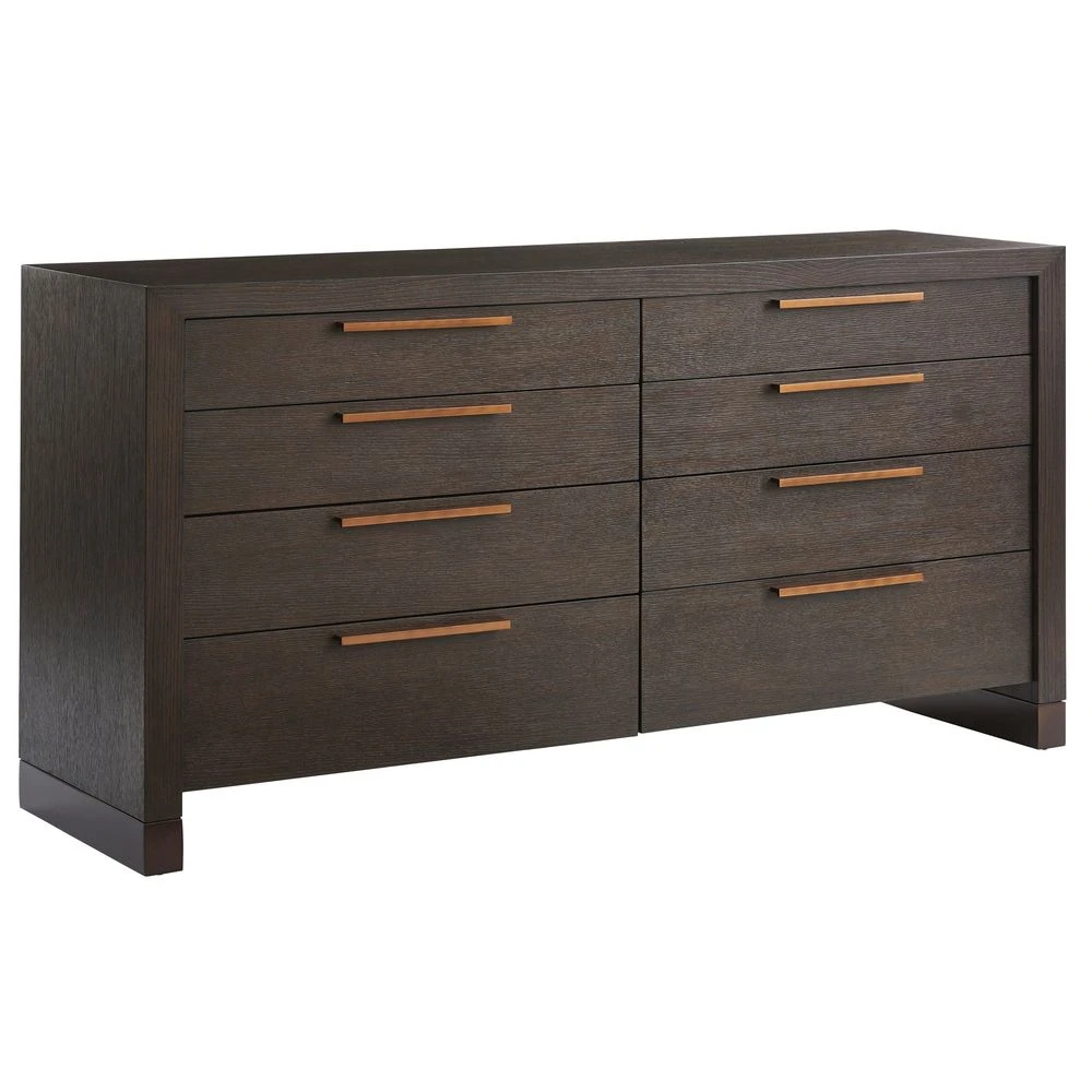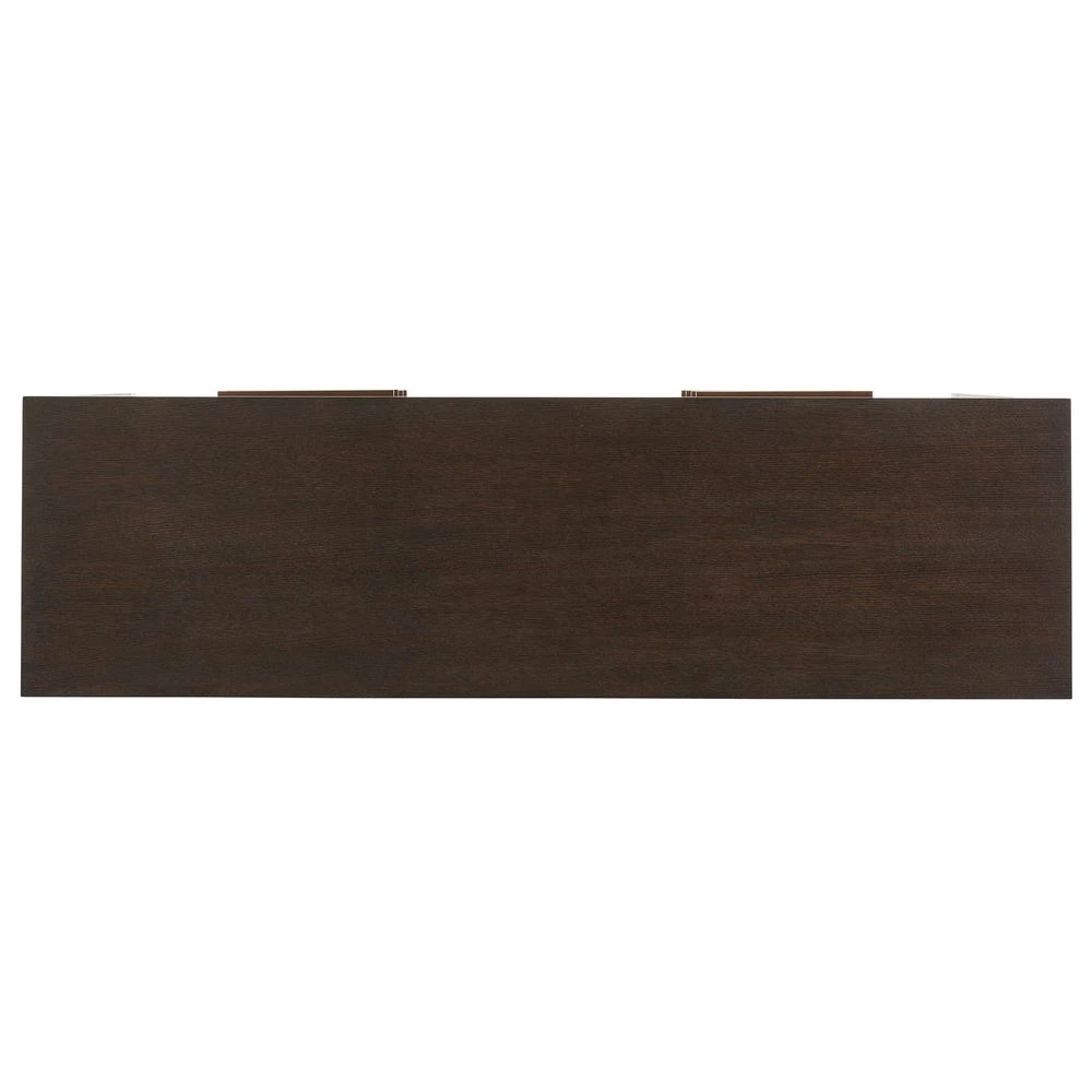 Marketing Copy: Highlighted by the elegant grain patterns of quartered white oak, designs in Park City boast clean architectural lines in a rich dark mocha finish. Custom hardware and metal accents framing the bases on many items are finished in burnished bronze. Signature items incorporate faux horn, authentic hair-on-hide leather, Alpine marble tops and ultra-clear glass. Upholstery silhouettes reinforce the modern look with clean lines and meticulous tailoring using supple leather, textural fabrics, and neutral palettes. The interpretation offers a warm, elegant, and inviting look that defines luxury mountain living.