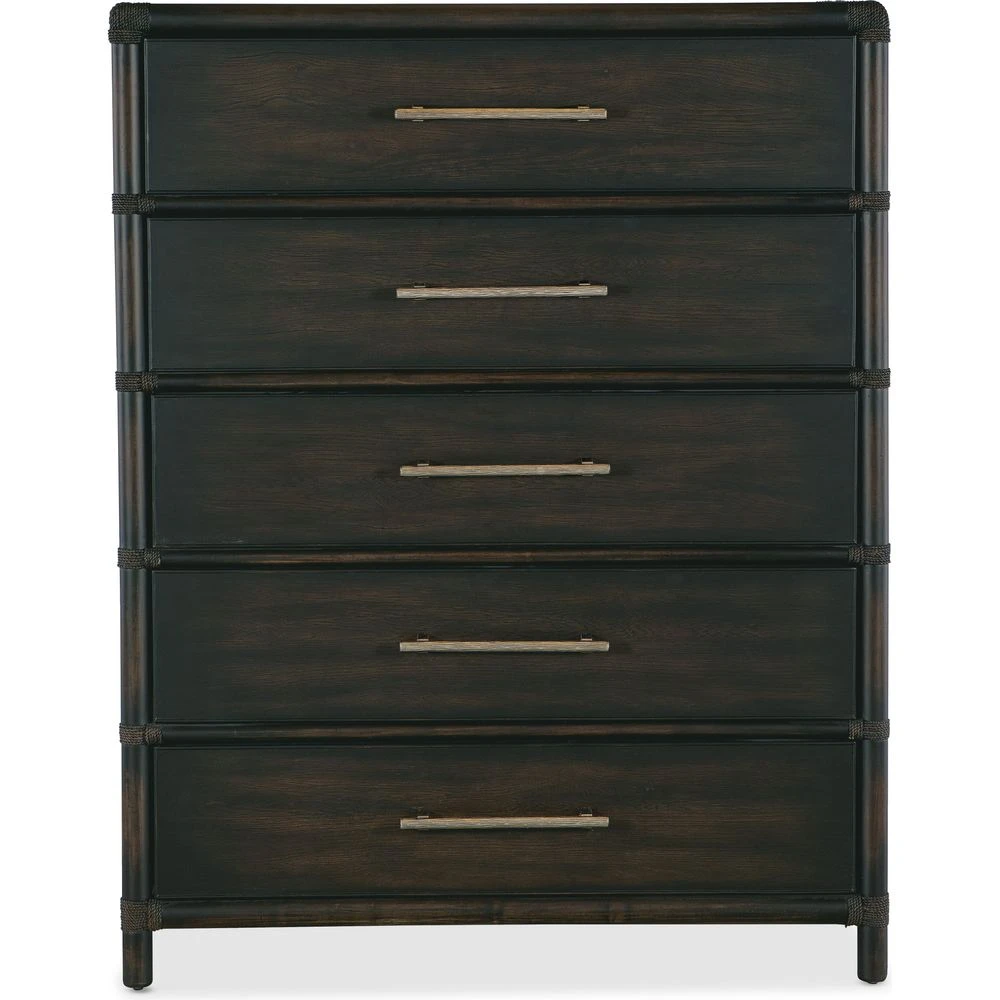 Description: Inspired by tropical getaways, the Solace Pole Rattan Five-Drawer Chest is a blend of natural materials in a laid-back, versatile design. Crafted of Oak and Maple Veneers with Rope accents, the chest is finished in Black Sand, transparent by design to reveal the unique grain patterns in the wood veneer. Offering five self-closing drawers, the top drawer has a removable felt liner and the bottom drawer is cedar-lined. The textured, pewter-colored bar pulls add a look of natural elegance.