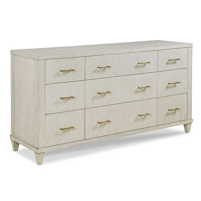 A terrific storage chest with nine individual drawers mounted with sturdy cast brass pulls flanked by squared corner posts.