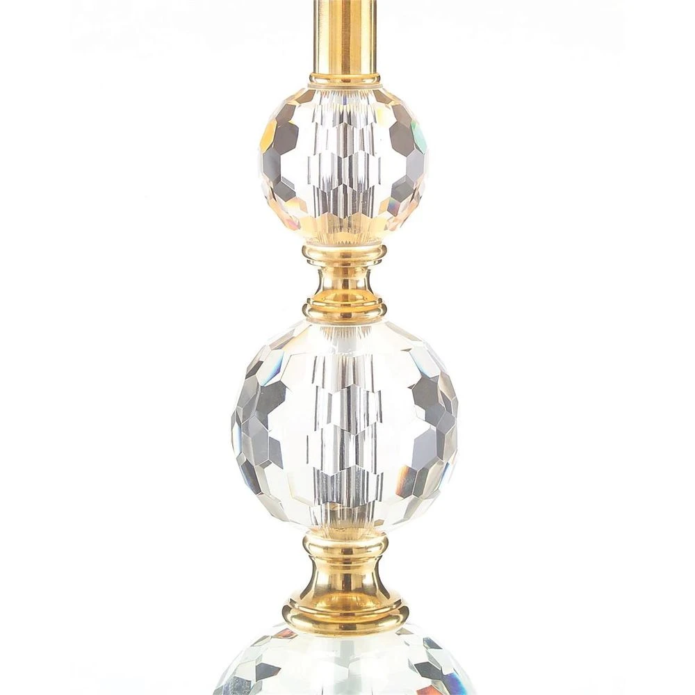 Description: This table lamp has stunning crystal spheres in an all-over-faceted briolette pattern that are stacked in various sizes on a heavy crystal and brass base.