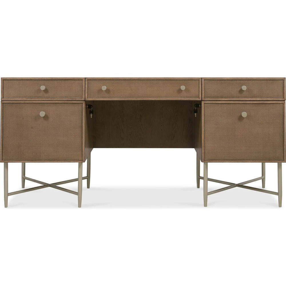 Description: Mixing Quartered, Cathedral-Cut Oak in an earthen-toned finish with cane-front drawers and a metal base, stretchers and tapered legs, the Sonnet Executive Desk blends natural textures with a refined minimalist silhouette. The five drawers have cane-inset fronts, and there’s a removable/interchangeable writing surface and pencil tray that can be used in either the right or left top drawer. Each of the top side drawers has two removable partitions. The center drawer has a drop-front writing surface and wire management. Two locking file drawers have a Pendaflex letter/legal filing system.