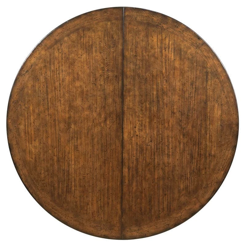 A round molded top with random cherry planks. The top is heavily distressed and raised by four ample saber legs that are joined by a shaped stretcher.