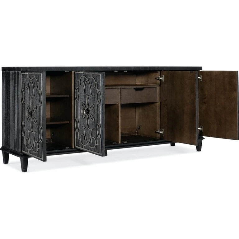 - Finish: Black wood finish with textured metal hexagonal knobs and silver accents