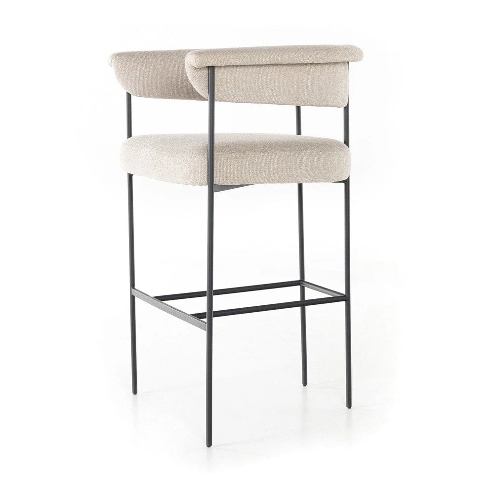 - Description: Airy and light with slim, black-finished iron framing, camel-colored upholstery lends texture to a beautifully sculpted bar style featuring a yoke back and exterior fold detailing.