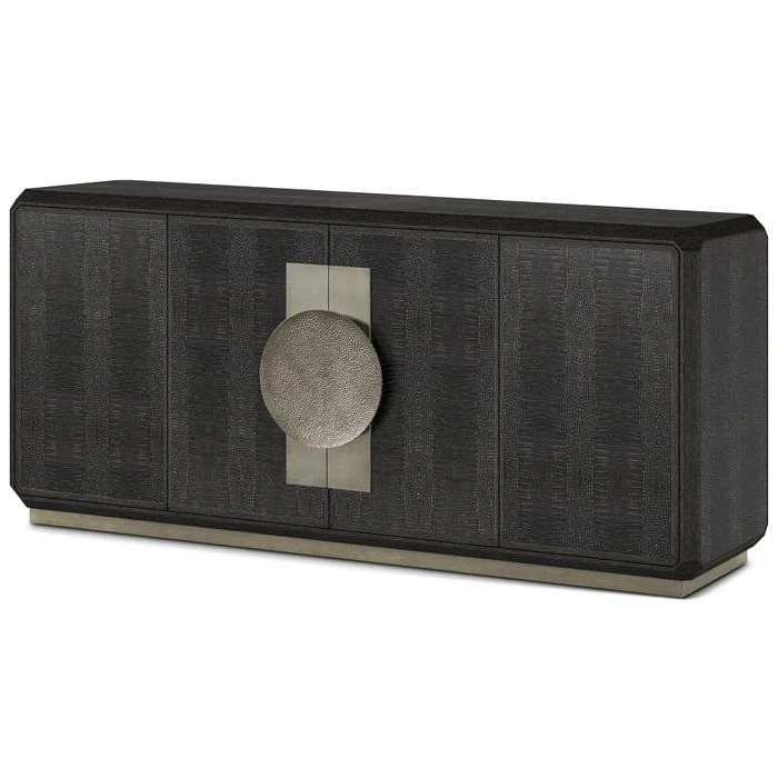 Description: The Spencer St. James collection blends contemporary flair with exquisite creativity and detail. Made of oak and adorned with crocodile-embossed leather and hammered metal hardware, Spencer St. James creates a textural statement. Available in a light Argento or dark Onyx finish.