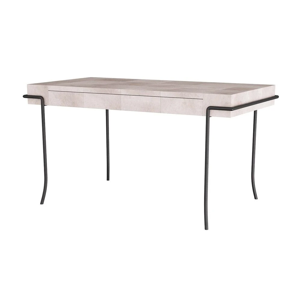 This handsome desk is amazingly versatile. Use it as a vanity, a sofa table, a console, even a bar. Use as a pair in a dining room for serving. Small enough to use bedside as the desk in a room. The ivory vellum surface lends luxe texture to any room in the house. The blackened iron legs add contrast to the top. Finish will vary.