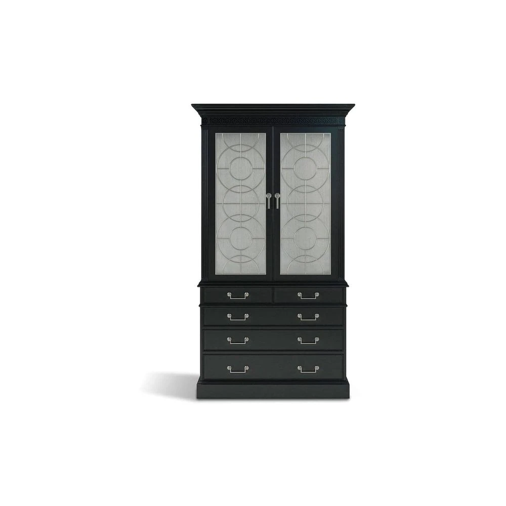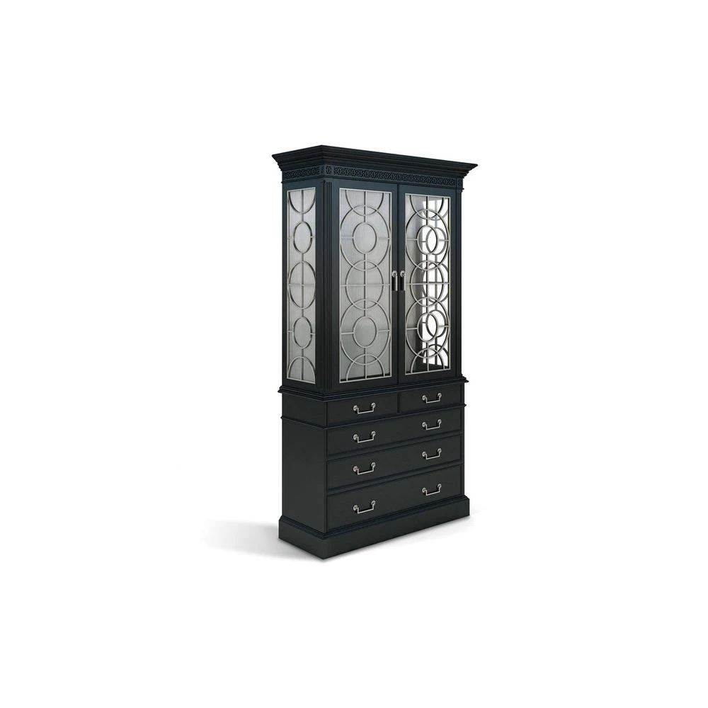 George II style black painted and crossbanded china display cabinet, the top section with a broken pediment centered with an urn, glazed doors with gothic ogee topped glazing bars, three glass inset shelves, and two short and three graduated drawers to the base. Range sensitive lighting with touch controlled dimmer.