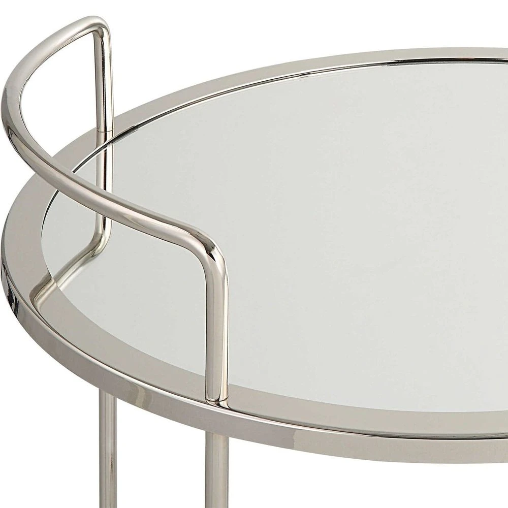 The Spritz Bar Cart rolls wherever the party goes! The metal cart is finished in polished chrome with dual mirrored shelves for optimal storage and display. The petite round frame sits atop rolling casters, enabling easy placement in any living or dining space.