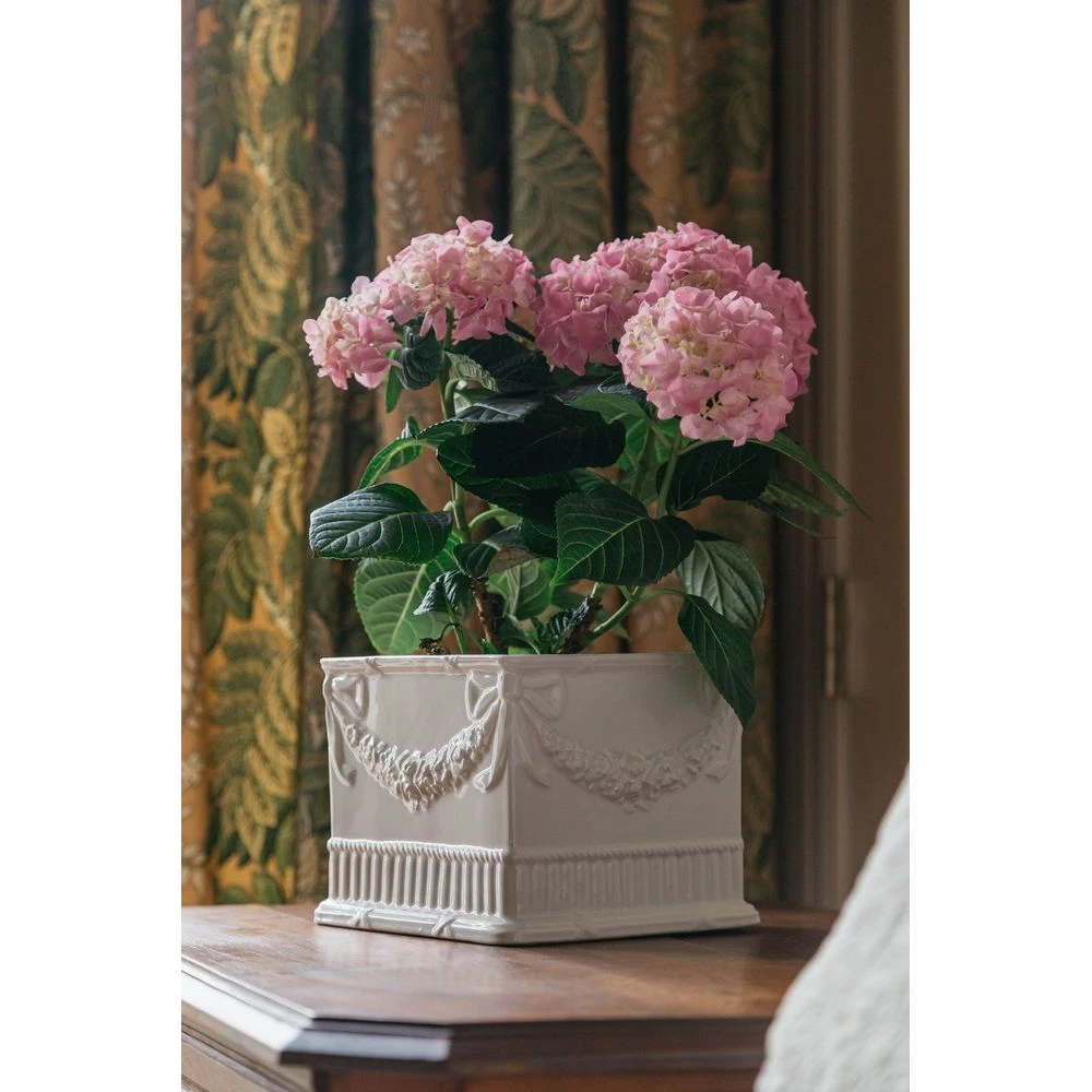 Description: These charming cachepots are made in the finest Italian tradition. Each one is adorned with a raised flower garland decor. Made in Italy. Available in round & square.