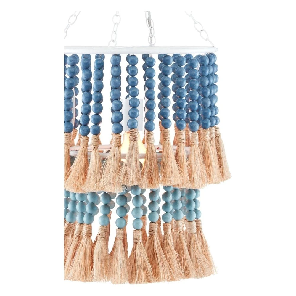 Description: Jamie Beckwith is the mastermind behind the St. Barts Blue Pendant, which is made of wood beads in a mix of white, mist blue, and denim blue hues that echo the colors of the sea. These hang from a double-tier wrought iron frame in a sugar white finish. The natural abaca rope on which the beads are strung is knotted and snipped by hand to leave elemental tassels that will flutter when stirred by a lively breeze. The beaded pendant is one of several ocean-inspired designs by Beckwith. Adjustable from 33″ to 100″ with use of included chain/rod kit/cable. If your space calls for a longer drop, additional chain/rods/cable is available for purchase.