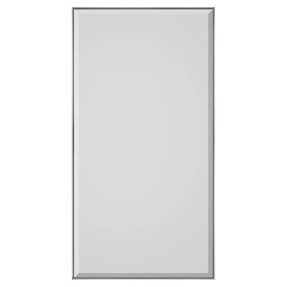 This contemporary beveled mirror is held within a slender floater frame with a Sterling finish. This gorgeous statement piece is designed for vertical and horizontal orientations.