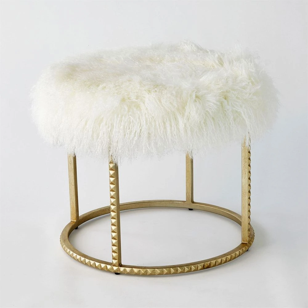 Description: Our Stud Pouf brings the artistry of hand cast iron to a new level with a unique and on trend design element. Tiny pyramid studs line the entire frame of this design, all gleaming with a hand gilded gold leaf finish. Topped off with an authentic Mongolian Lamb covered seat cushion, this piece will add the perfect pop of rock and roll chic to any space.