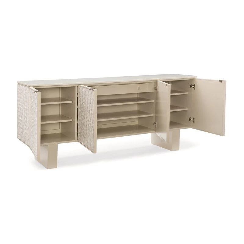 This dramatic sideboard is wrapped in three-dimensional rectangles of pearlescent shell, presented in a basketweave pattern, resulting in a cabinet with unprecedented luster and sheen. Topped with white stone and fitted with Soft Taupe adjustable footings, this piece stands up to the height of a credenza or drops down to the height of an entertainment center. Featuring four doors with hidden pulls and loads of storage, Bomb-Shell takes center stage in any room.