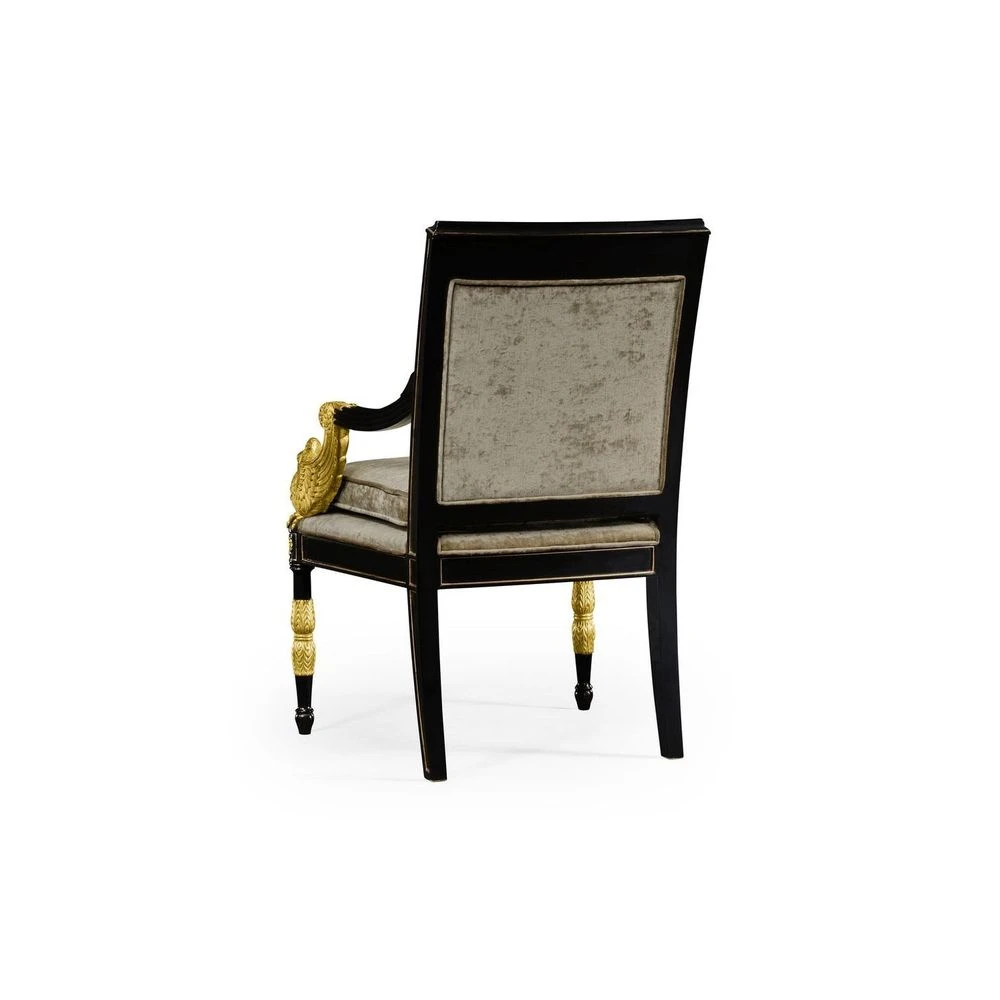 Finely carved and gilded arm chair after early 19th century French Empire designs with sweeping low arms terminating in stylised swans. Ebonised finish highlighted with palmette and lotus leaf detail. Fully upholstered back and seat.