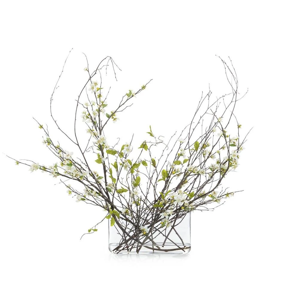 Description: Natural river birch branches with apple blossoms are in faux water.