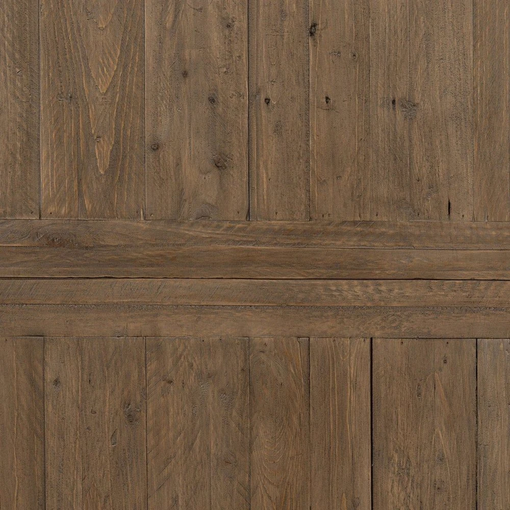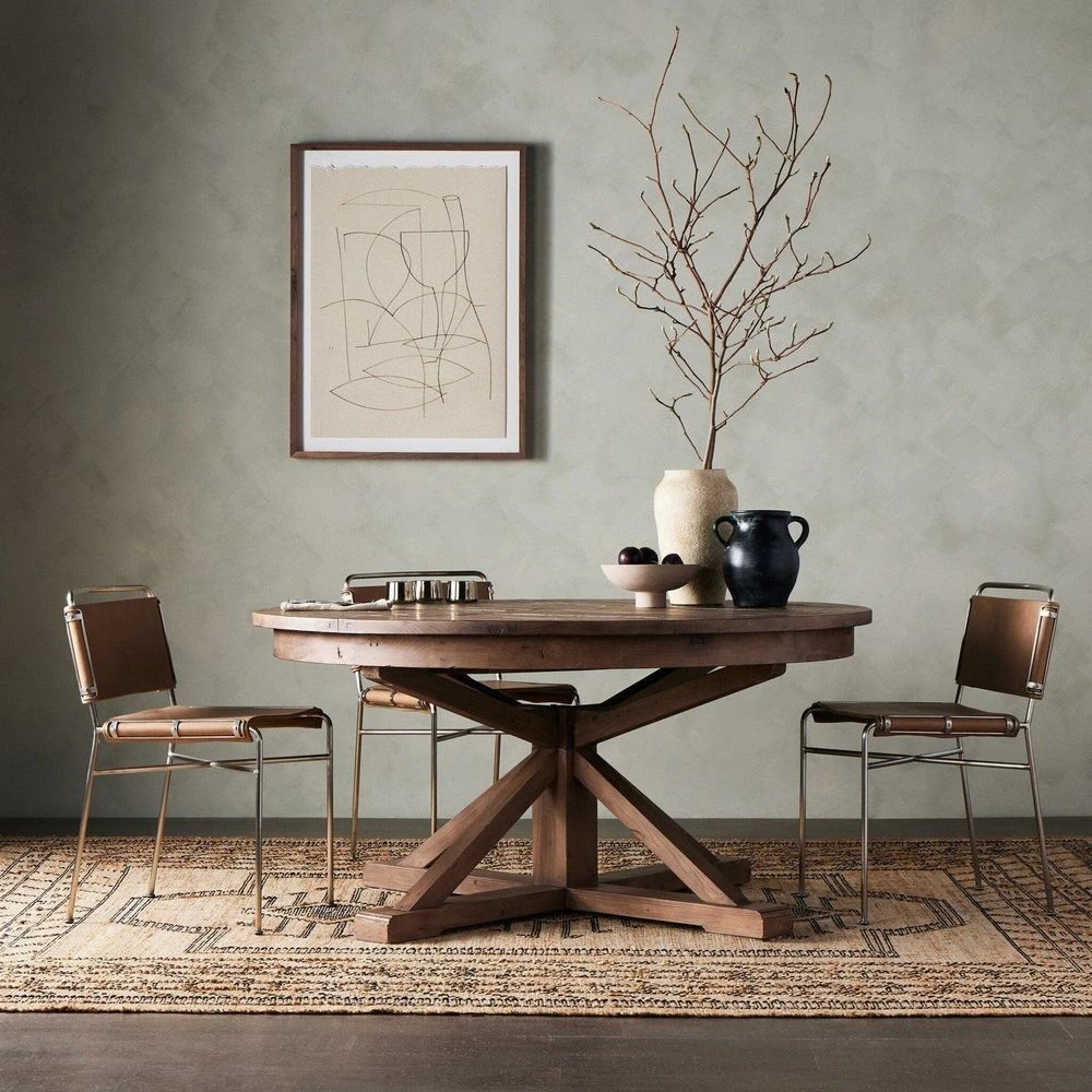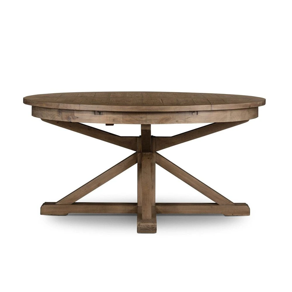 - Description: A welcoming, round farmhouse table draws the eye with its reclaimed wood top and a compelling architectural base in a rustic black olive finish. Easily extends to 79″ with built-in leaf.