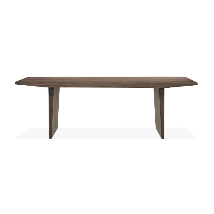 Description: Featuring a solid wood face frame, the geometrically inspired Tangent dining table makes a bold statement in any dining space. Veneered in walnut and finished in a matte, water-based finish, the tabletop is supported by two dynamic, angular pedestal bases.