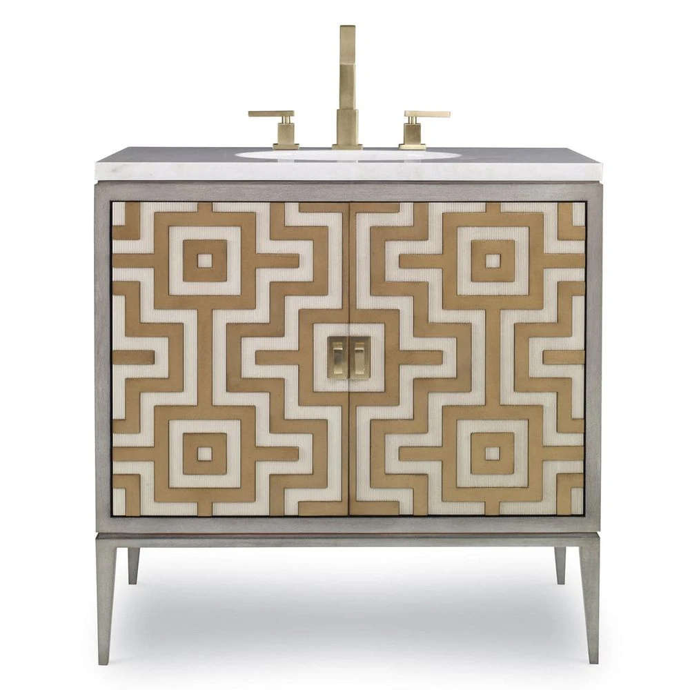 Constructed from high-quality Mahogany solids and veneers, this sink chest boasts two doors with ivory textured panels and intricate gold painted fretwork. The elegant ash grey finish on the exterior, top, and base is complemented by brass hardware for a timeless and sophisticated look. Topped with a luxurious Primavera White marble top and an oval porcelain sink bowl, this sink chest is truly a masterpiece in both design and craftsmanship.