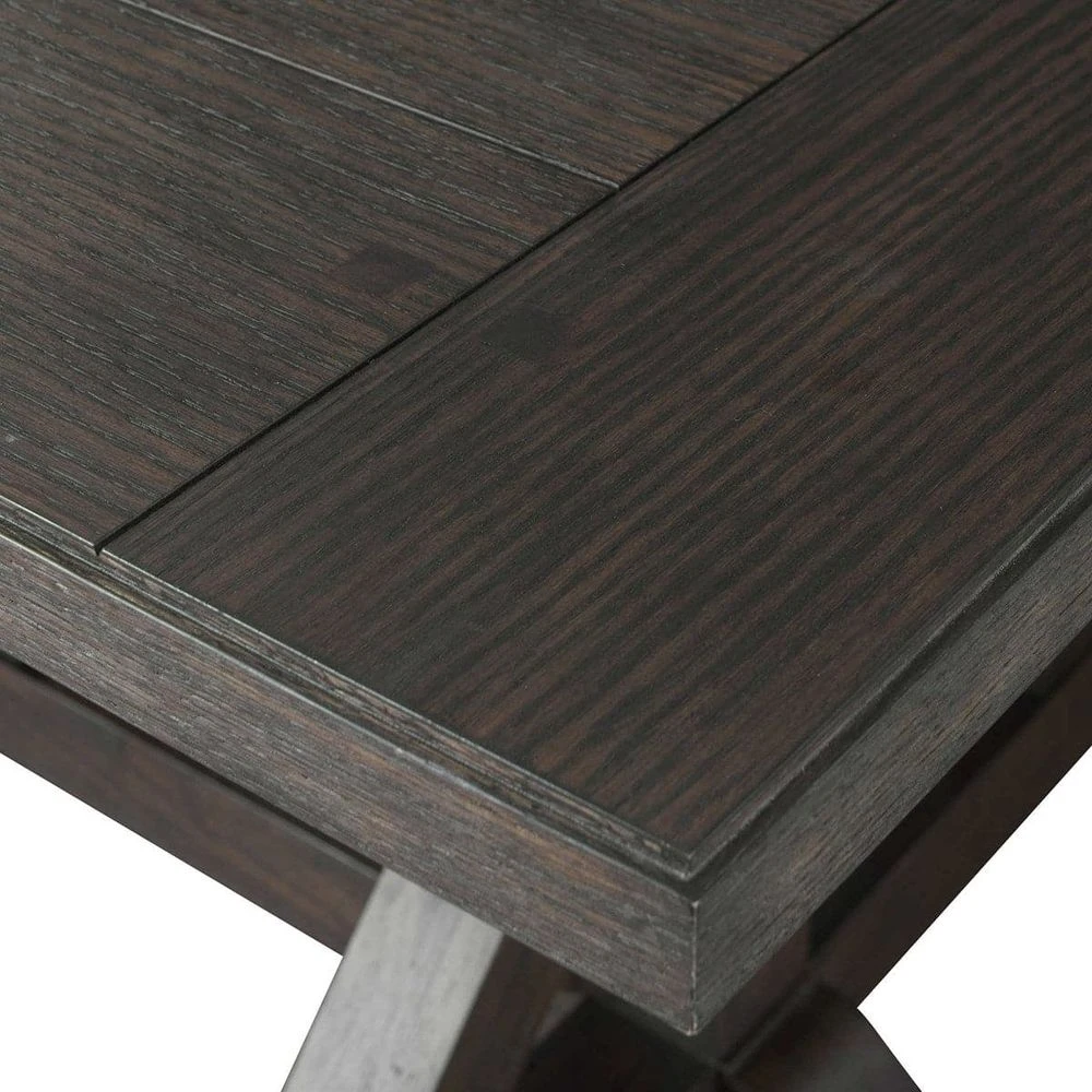 A modern version of the classic farm table. The top, in a dark espresso finish that highlights the open grain, appears as large planks with square pegged construction. Made of solid and veneer American white oak. The base, inspired by architectural trestles, is crafted from Mindi wood, native to Indonesia and similar to an American oak. With one 20″ middle leaf, this extension dining table goes from 98″ to 118″ and can seat up to 10.