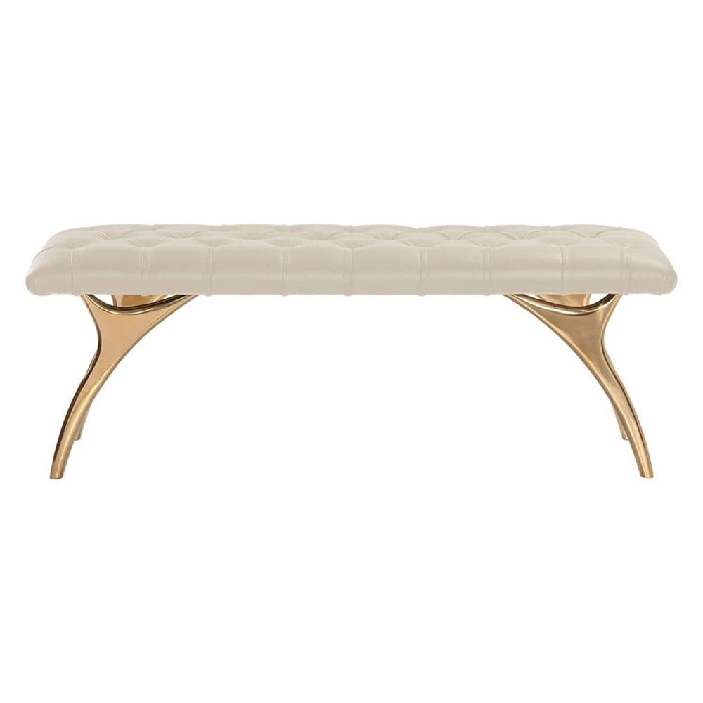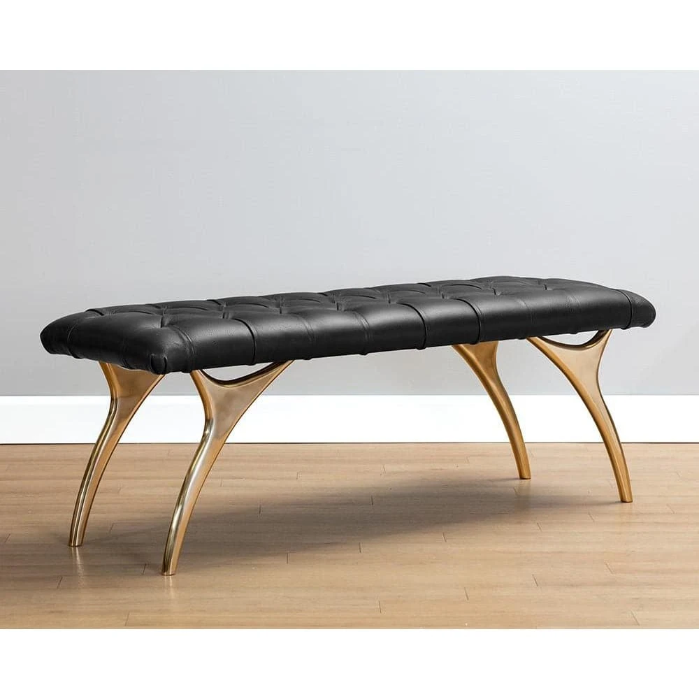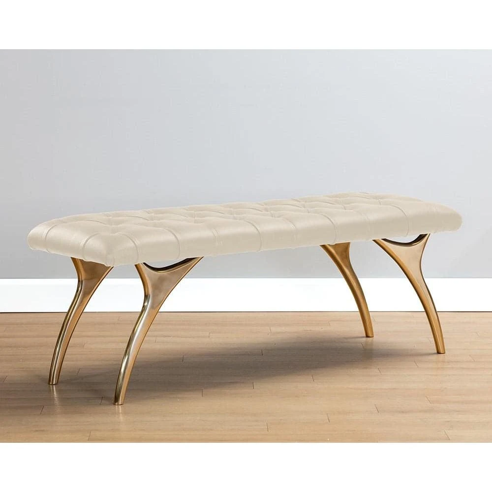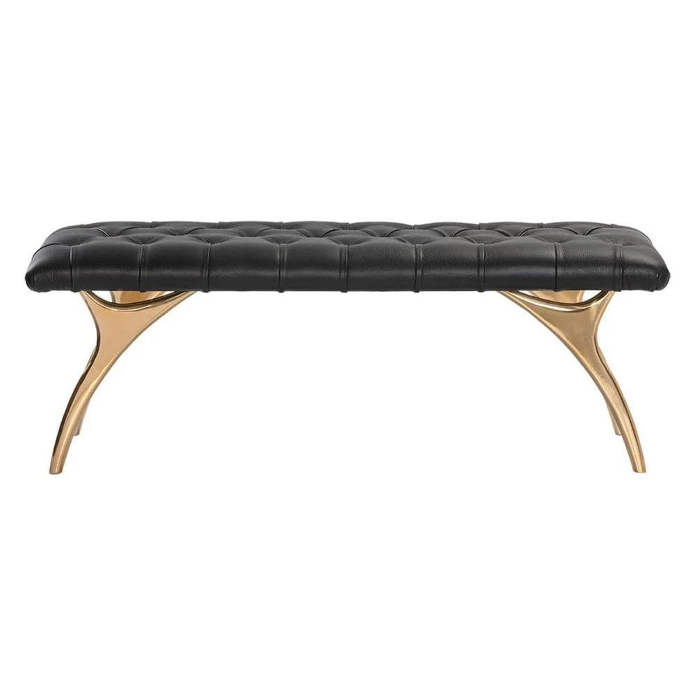 This contemporary bench features an eye-catching design with a touch of elegance. The design features a sculptural gold finished aluminum base with a tufted seat in black or cream leather. Handle with Care: This design has been crafted with 100% genuine leather. Leather is a natural material; as such, colour variations, markings, wrinkles, grooves and light scratches are acceptable and appreciated characteristics. No two pieces are alike. Visit our Product Care page for more information on how to ensure the lasting beauty of this piece.
