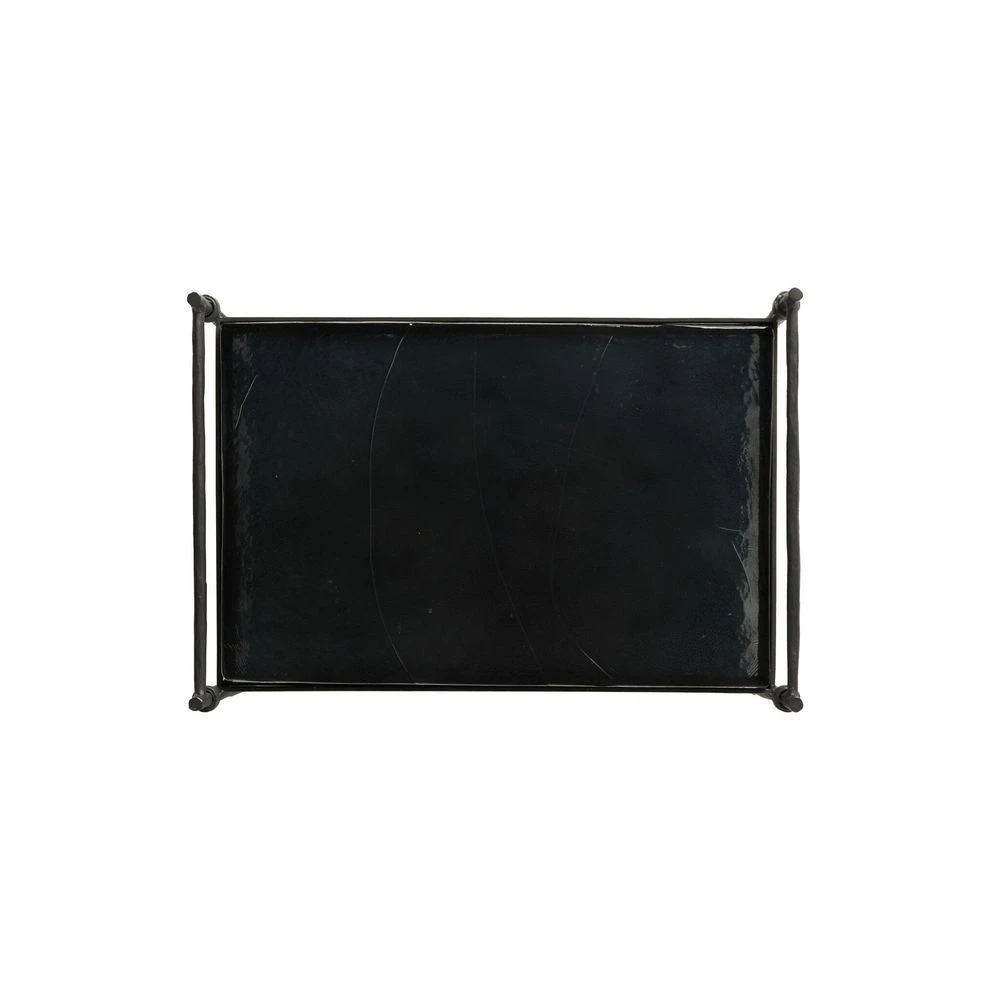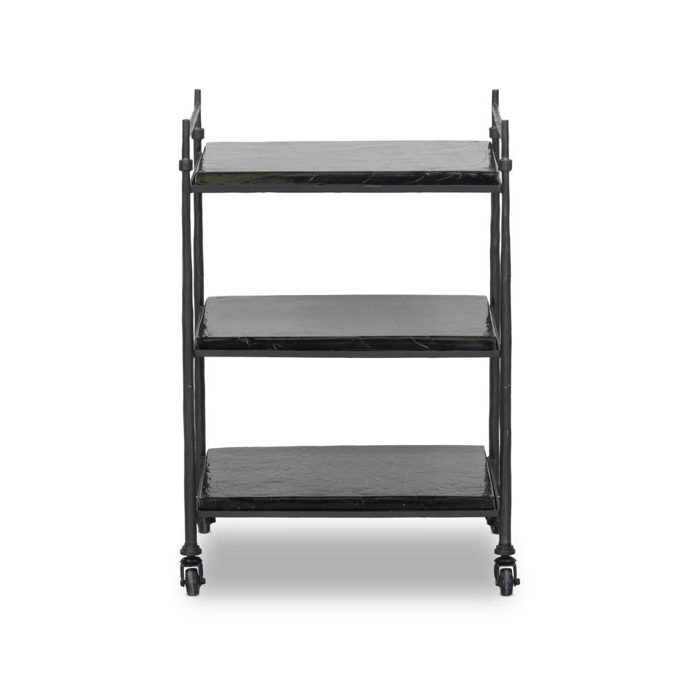 Description: Elevate cocktail hour with an always-in-style rolling bar cart. Crafted from black hammered metal with three tiers of smoked cast glass, offering smooth surface space for storage and display.