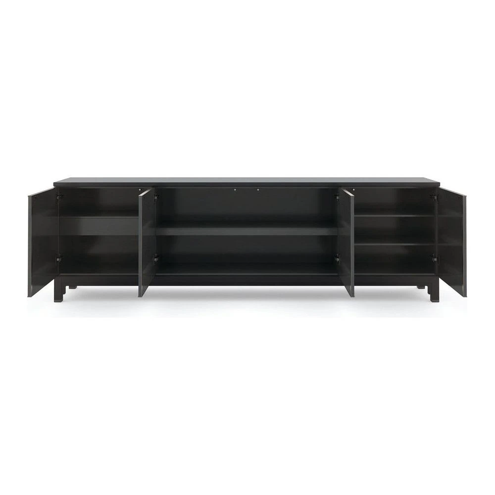 Inspired by Silk Road, an expressive portrayal of the infamous road from Xi’an to Constantinople as painted by artist Iris Feng. A reproduction of original artwork was digitally printed on canvas and hand-applied to the wood door fronts. Encased in Satin Ebony for added depth, this beautifully rendered piece is designed with four touch-latch doors to seamlessly conceal storage space within. Perfect for media and entertainment, it features a center drawer, adjustable shelves, and cutouts in the back panel to allow for cord management. Its fluid design also works well in foyers and entryways, or as a statement-making buffet.