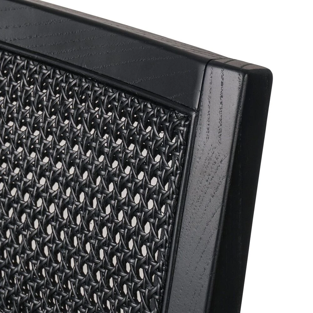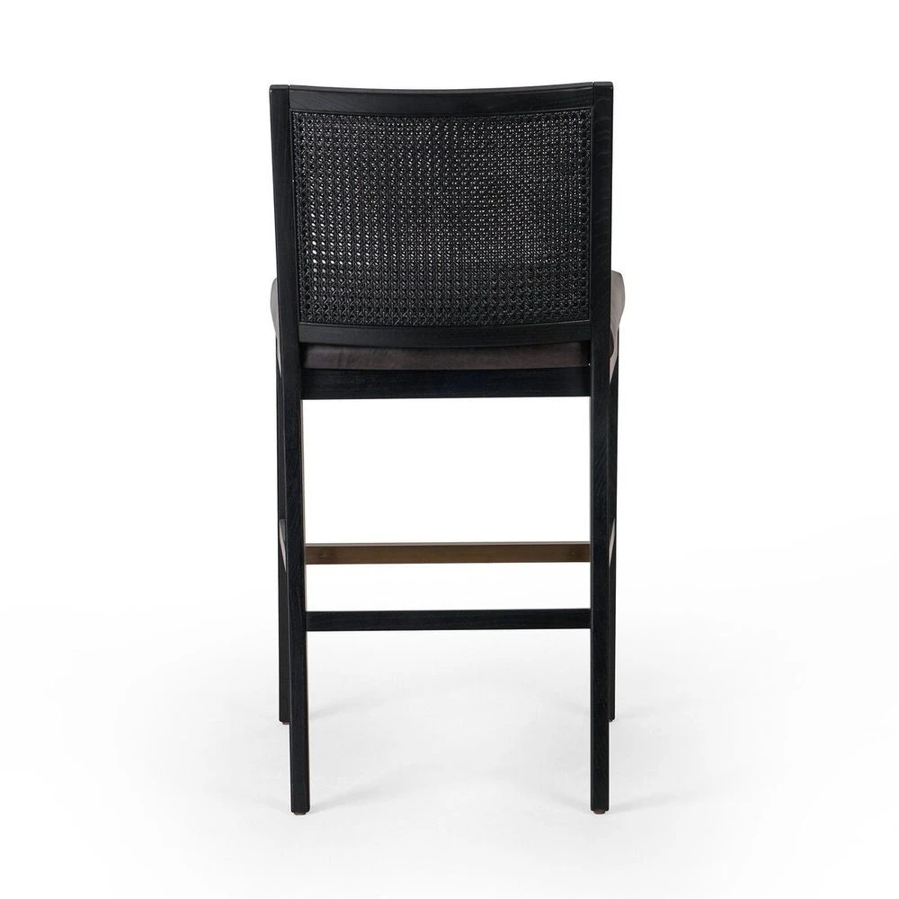 Ebony-brushed parawood frames a textural cane inlay, with top-grain leather seating in a chic black. Perfectly sized for the bar, with a brass kick plate for comfort and contrast.