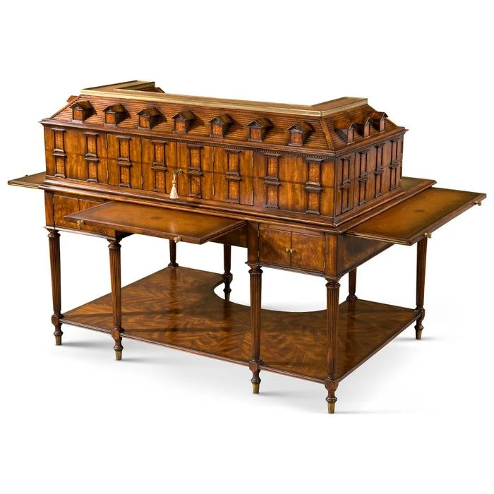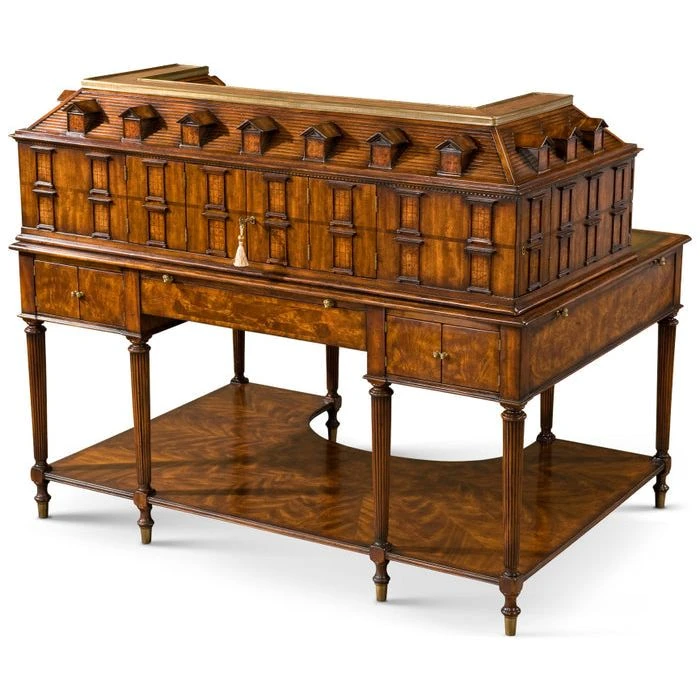 Description: A mahogany and brass mounted desk in the form of Althorp, fitted with numerous hidden drawers and doors, the desk with a leather inset moulded edge top fitted with slides and three frieze drawers with Spencer crest handles on eight turned, reeded and tapering legs united by a solid undertier on brass capped peg feet.