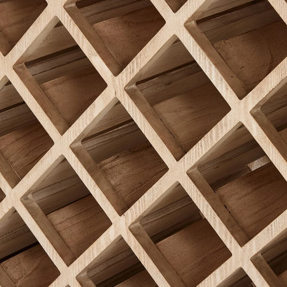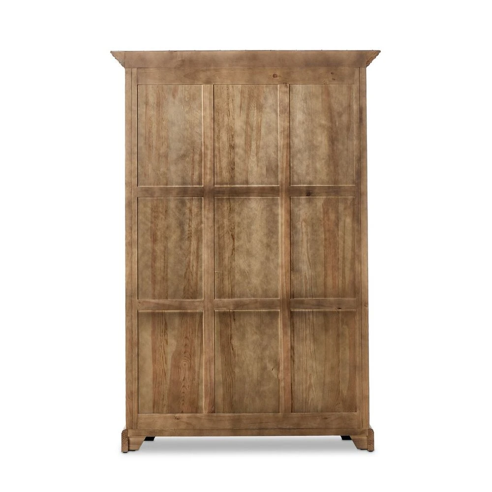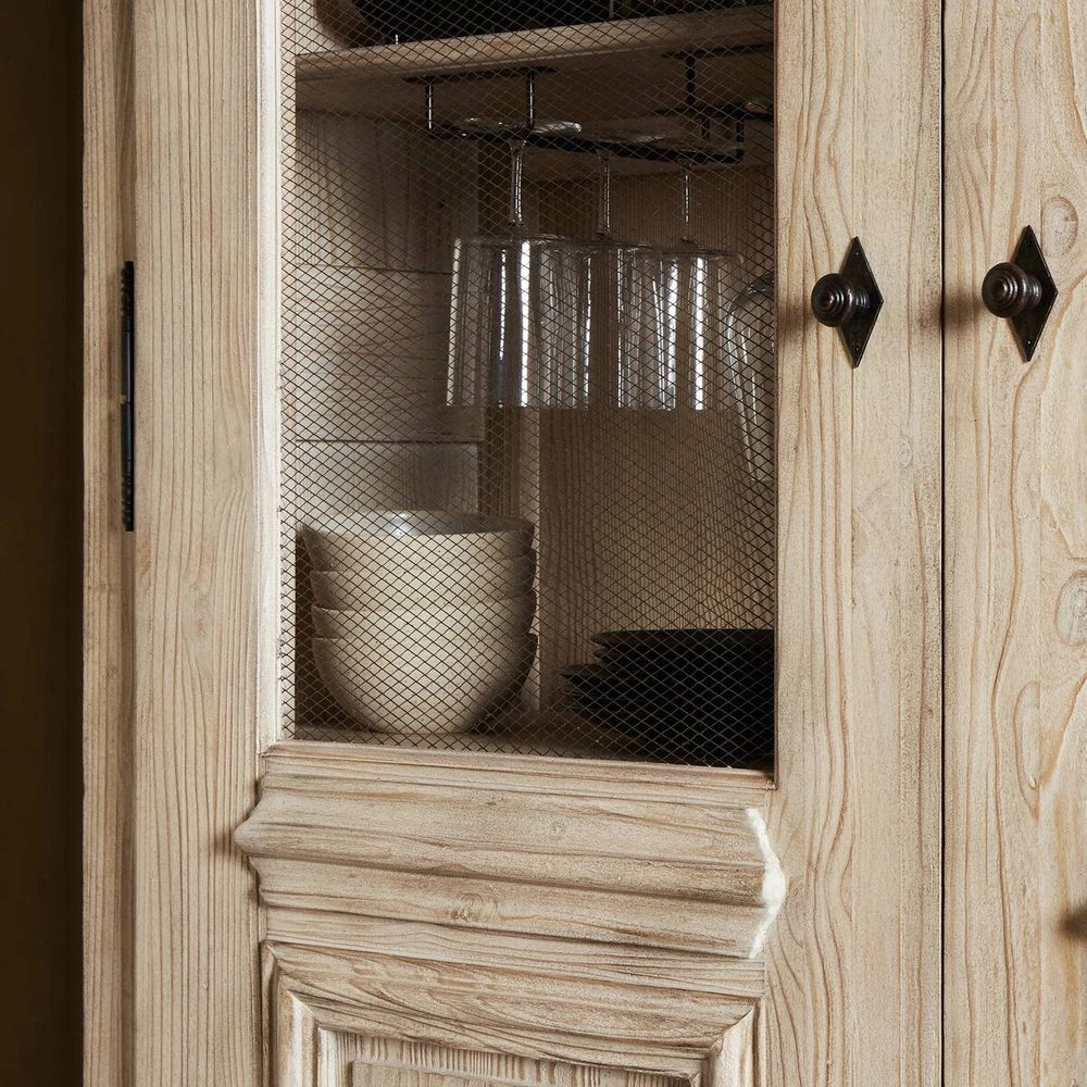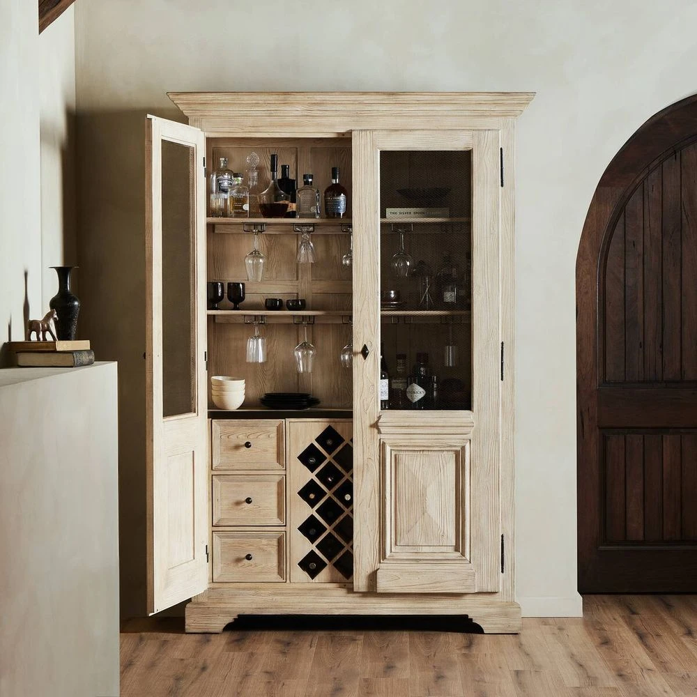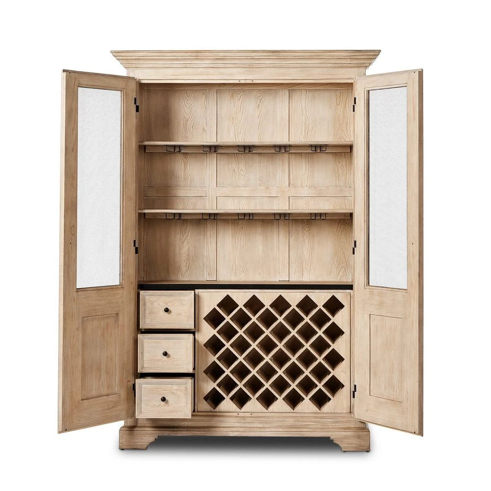 By the makers at Van Thiel, known for their antique-inspired pieces and hand-applied finishes. Influenced by a Scandinavian antique, this grand-scale cabinet features drawers and 12-inch depth wine storage î perfectly sized for standard bottles î all behind bronze mesh doors. Features subtle distressing throughout for the look of an heirloom.