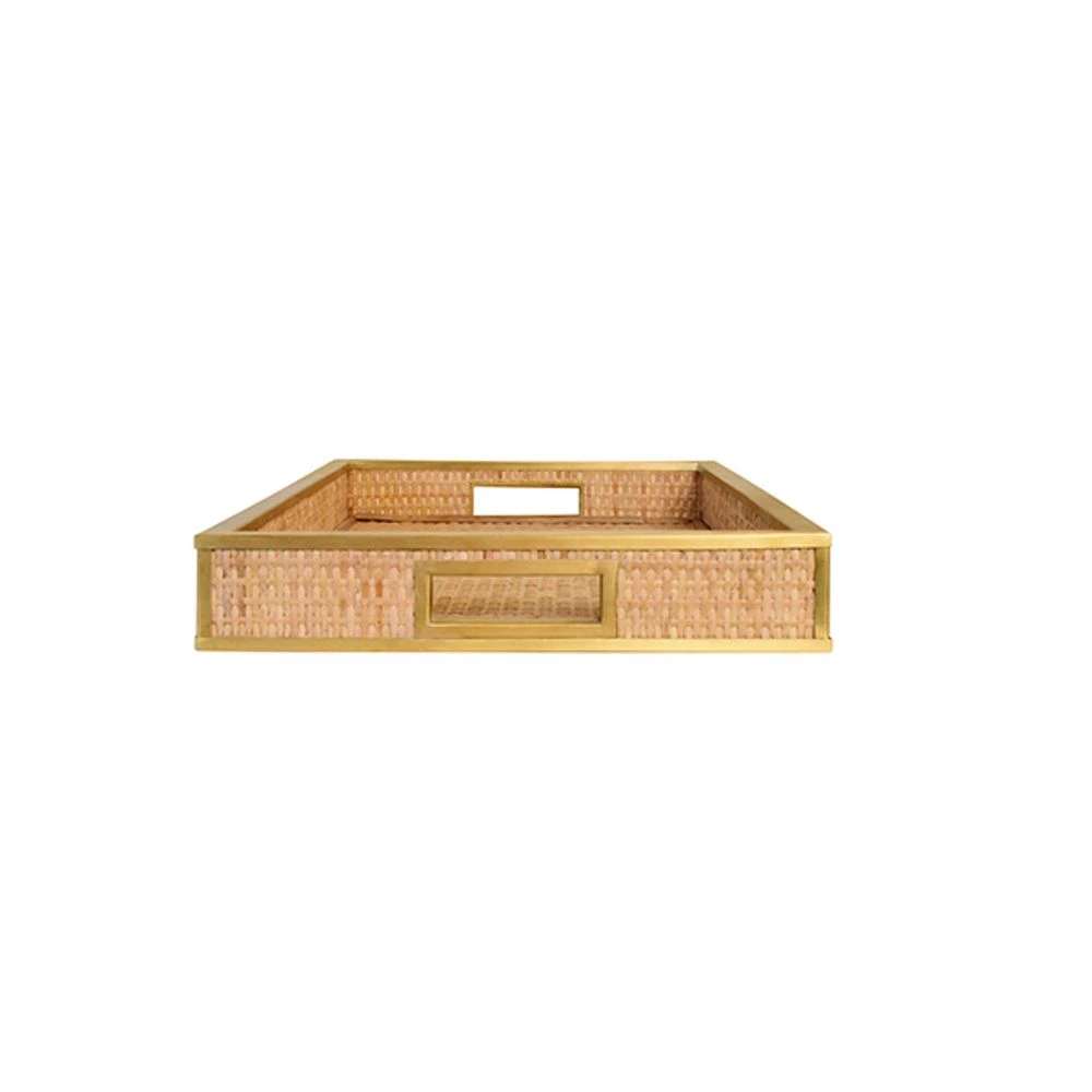 Description: RECTANGULAR NATURAL WICKER RATTAN TRAY WITH FRAMED BRASS EDGE