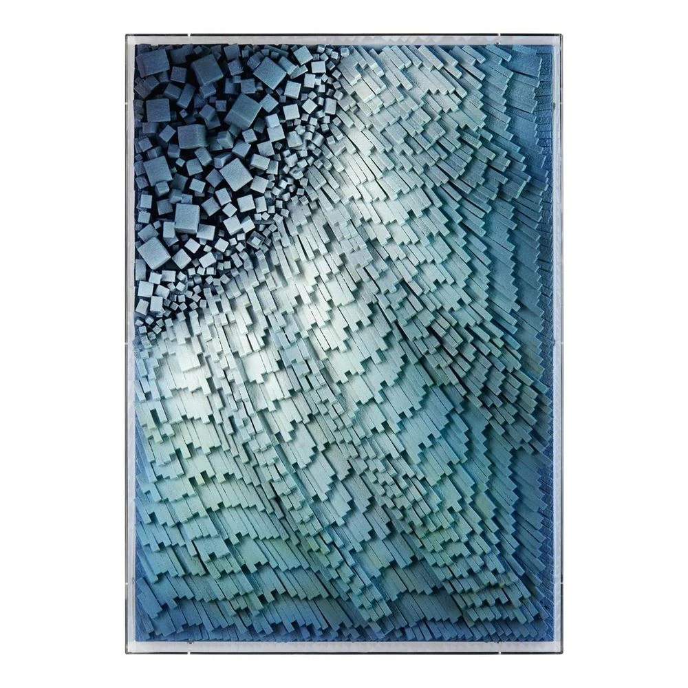 This structural piece by Daniel Fey displays a flowing perspective with the interaction of movement, shapes, and shadows in blues, greens and white. The art is surrounded by an acrylic box.
