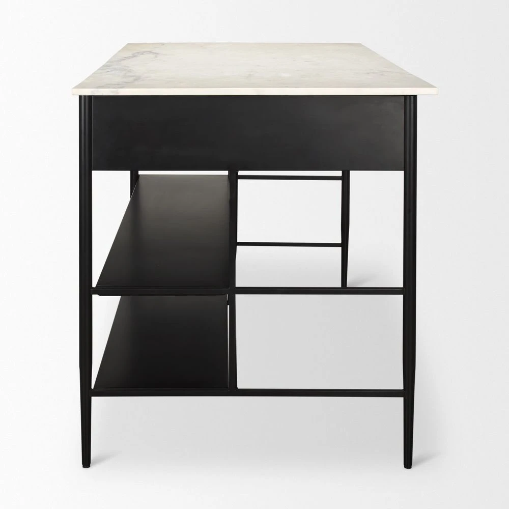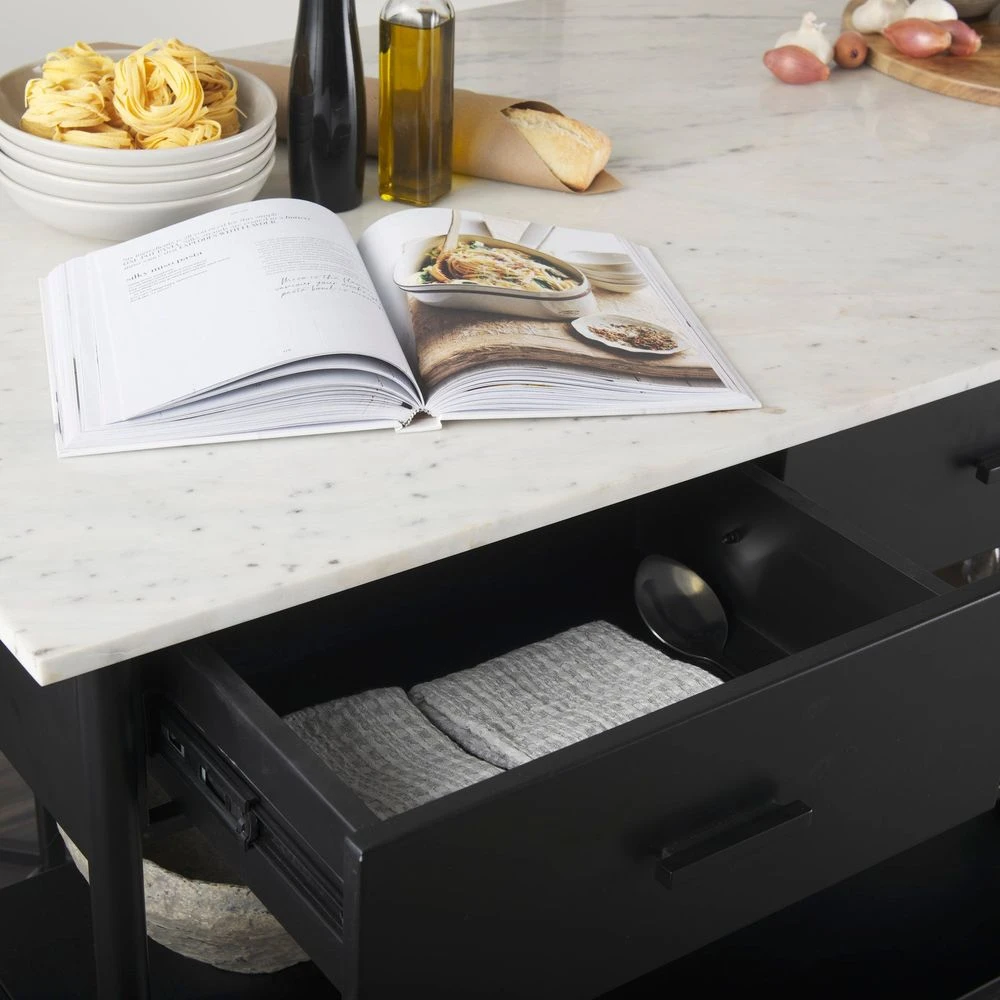 Description: Toryn Kitchen Avand is a chef’s style portable island made of black iron metal and white banswara marble top with polished, smooth, straight edges and features three drawers and two shelves.