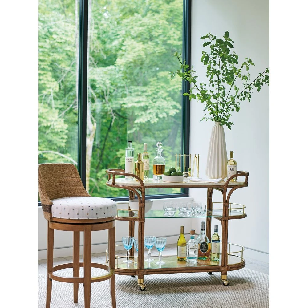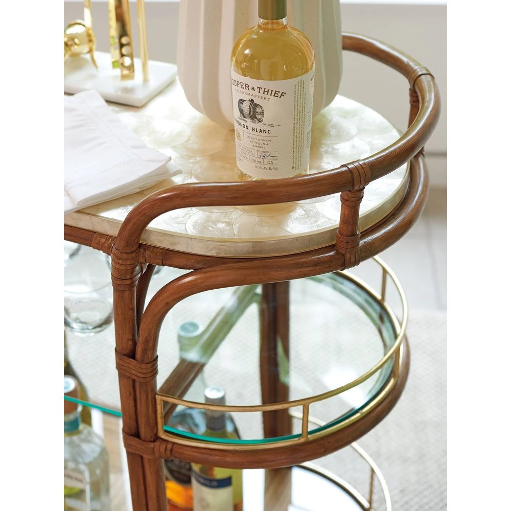Marketing Copy: The community of Palm Desert in California is a remarkable place where rugged mountains provide a backdrop for palm trees, lush landscaping and world-class resorts. The prevailing aesthetic blends casual contemporary design with clean architectural lines and a touch of Mid-Century Modern, for a luxurious, relaxed and understated look. The Palm Desert collection features designs in a warm sundrenched finish with an amazing assortment of accent materials including woven raffia, lampakanai, pencil rattan, Anticato marble, gold-finished silver leaf, White Cordova stone, and Capiz shell. The result is a portfolio of original designs and custom upholstery that will transform the look of your home, and convey the effortless style of destination living.