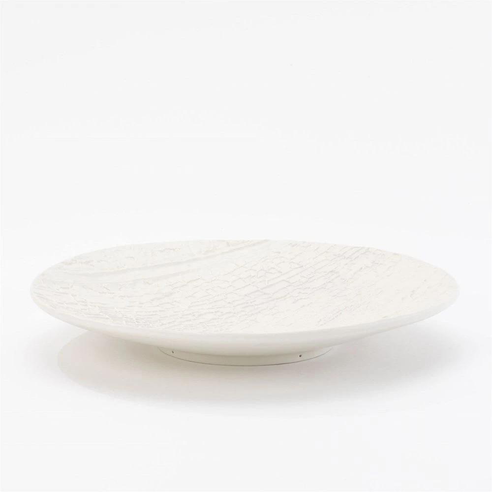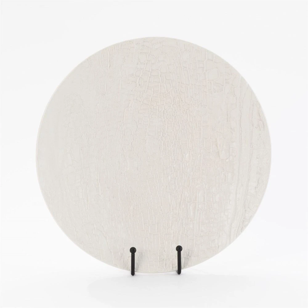 Description: Nature is recreated in this extraordinary Tree Texture Collection. This plate is made with the relief of a burned Poplar tree. Part of the tree that died but, the remainder of the tree is still alive.Truly taken directly from tree bark, molds are cast to then reinterpret into vessels and decorative accessories. This charger is glazed in matte white and can be displayed on a charger stand.
