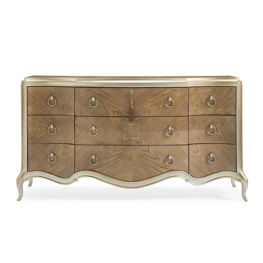 Perfect from every angle, this elegant triple dresser adds a touch of chic sophistication to any bedroom. A shapely serpentine silhouette enhances the visual appeal of its classic nine-drawer design and is highlighted with exquisite veneers in a Cendre finish trimmed in Champagne Mist. Inspired by the ornate beauty of the Rococo period, this stunning storage piece features one-of-a-kind carvings and shapely cabriole legs that give a nod to the past while delivering a refreshing contemporary interpretation. Custom-designed ring pulls with vintage cameo summarys add a finishing touch to this dresser in just the same way jewelry completes an outfit.