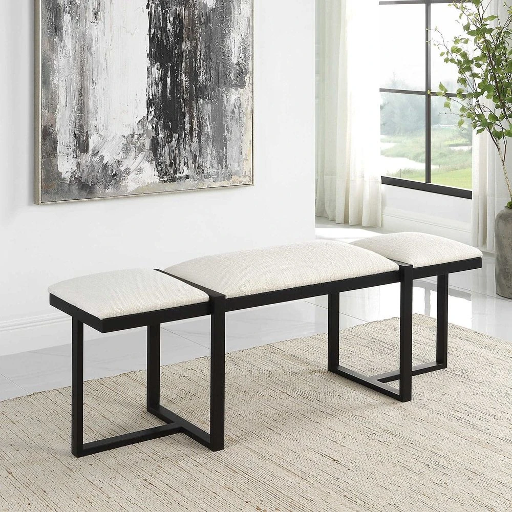 This modern design welcomes you and your friends, showcasing an angular black iron framework with three upholstered seat cushions in a textured white polyester performance fabric.