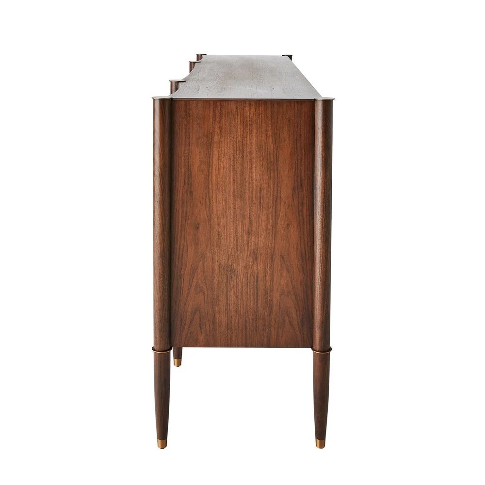 Description: The Triple Curve Cabinet, designed by Edward Nader for Global Views, reinterprets classic traditionalist style with a modern sensibility. Crafted from rich walnut wood and veneer, it features an interior with acacia veneer, adjustable shelves, and soft-close drawers. Aged brass handles, trim, and sabots add a refined, luxurious touch.