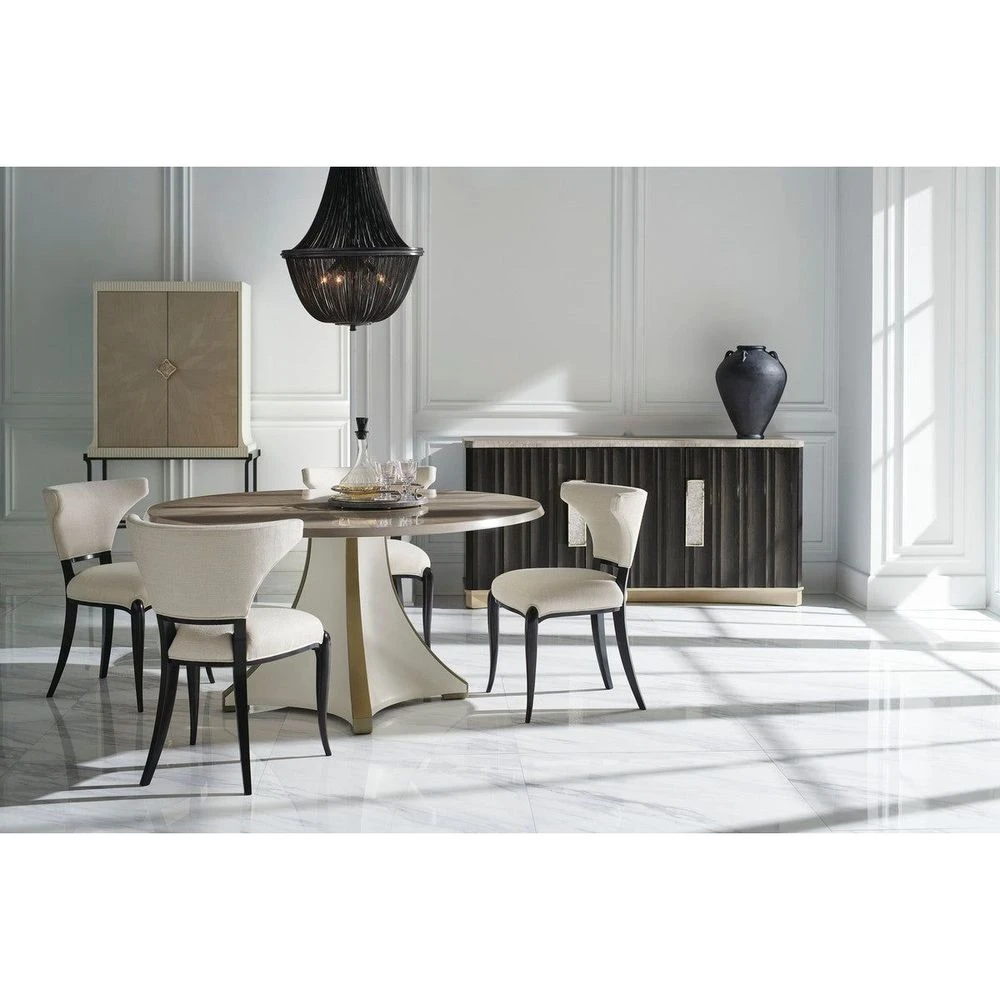 Meticulously handcrafted with a curtain-fold carving on the doors and subtly curved plinth base, this buffet makes a dramatic statement. Majestic Gold-plated, rectangular door pulls inset with crushed crystal acrylic create warmth and shimmer against its dark, Charred Bark finish. Merging form with function, it features a silver Travertine stone top and ample storage for linens and entertaining essentials, including a top shelf that flips to store stemware and bottles.