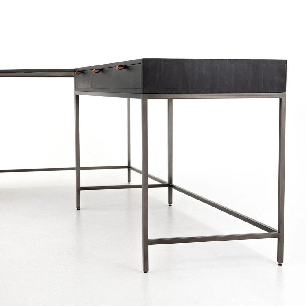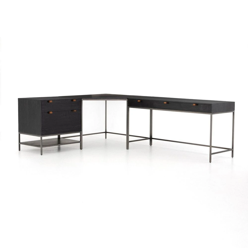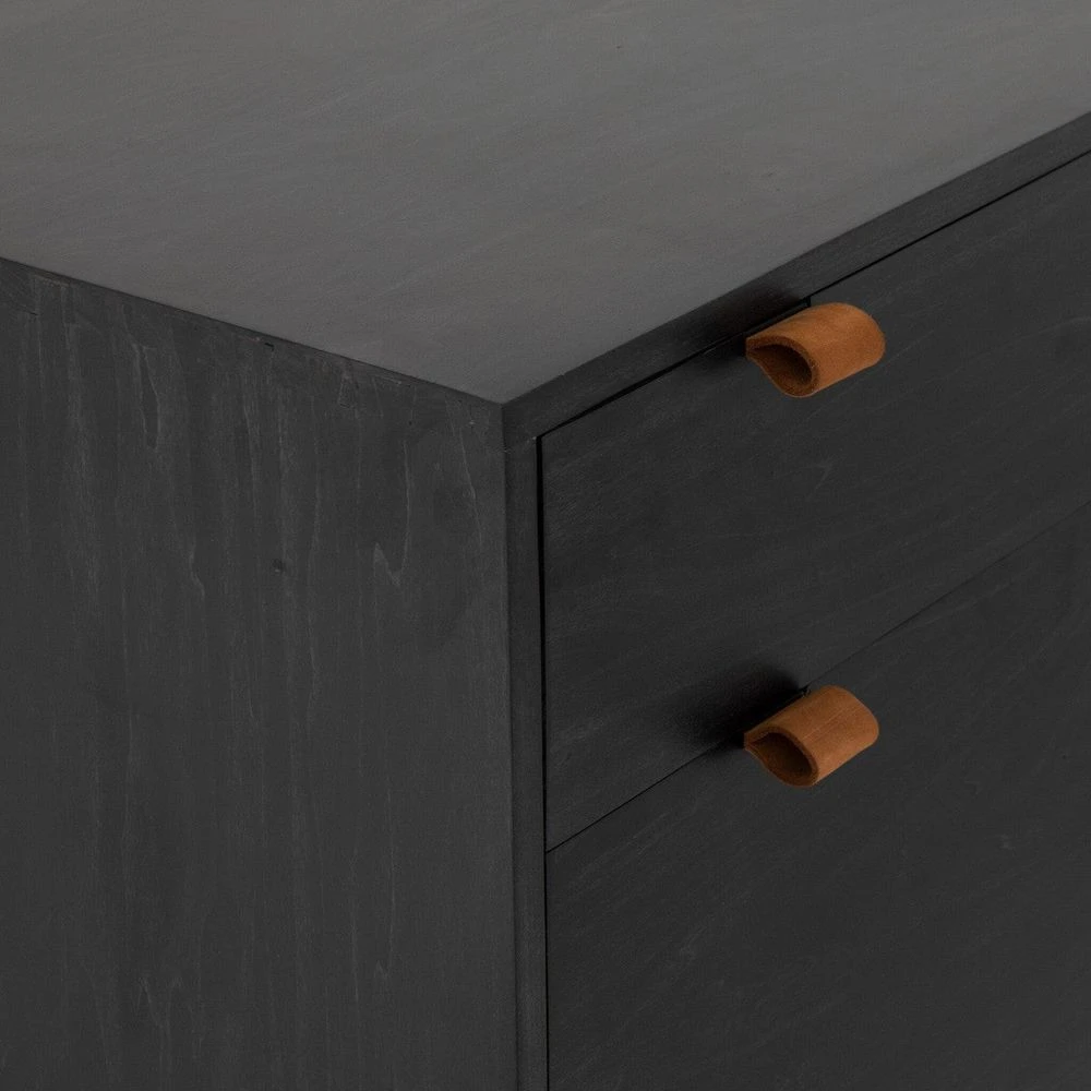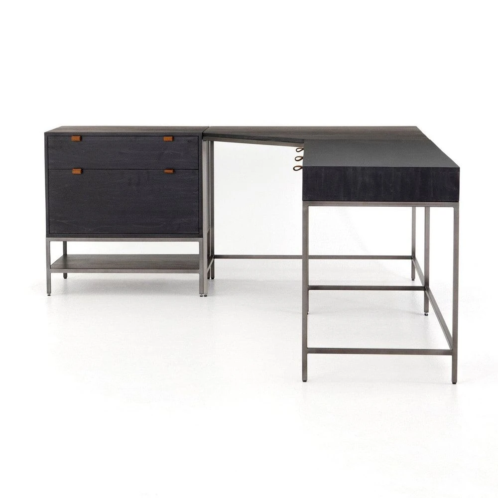 - Description: Inspired by clean mid-century design, greyish auburn poplar offers plenty of desk storage by way of three spacious drawers. Metal-secured leather pulls add a textural element of surprise. File drawers for handy storage of legal and letter sized documents. Cabinet can be styled on either side of desk for great flexibility in any space.